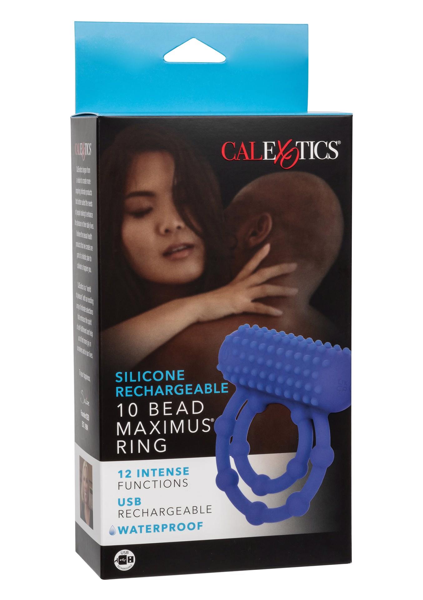Double your pleasure when you slip on the Silicone Rechargeable 10 Bead Maximus Ring. This stretchy ring is lined with daring pleasure beads and topped with a nubbed teaser that shakes to the rhythm of 12 functions of vibration.