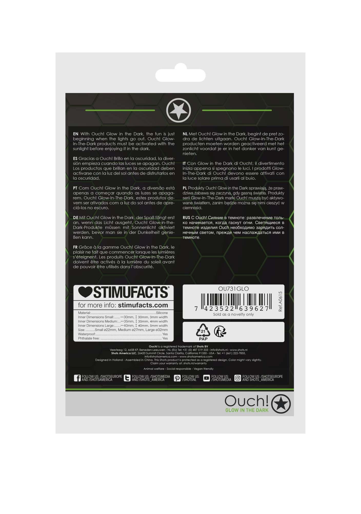 Ouch! Glow in the Dark. Zaprojektowane z autentyczną estetyką bondage, ale z dodatkową radością wynikającą z właściwości świecących w ciemności, fluorescencyjne zielone detale sprawią, że każde wydarzenie stanie się częścią. Z Ouch! Glow in the Dark, zabawa dopiero się zaczyna, gdy zgasną światła.