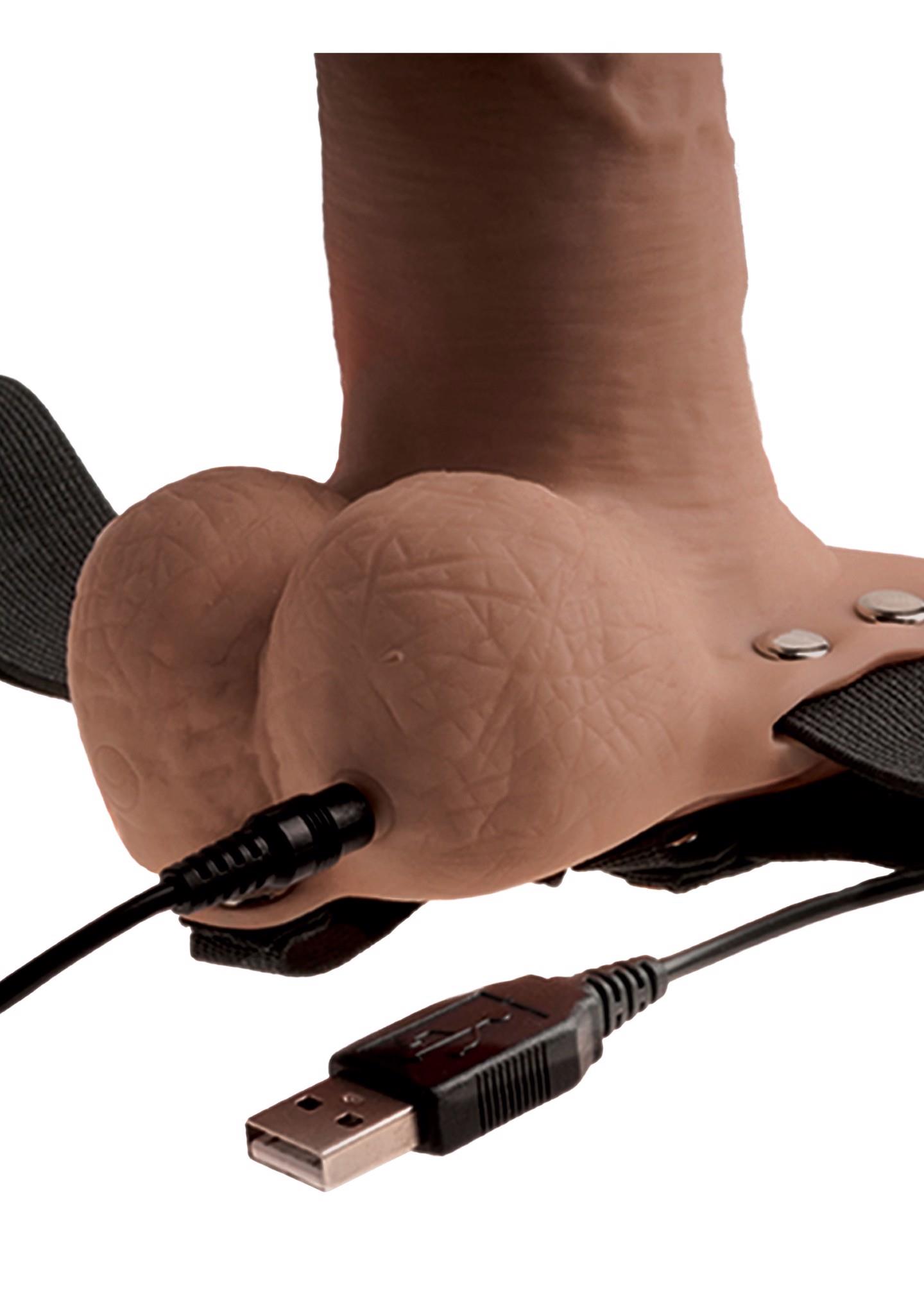 Have you always wanted to feel more confident about your size and enjoy satisfying sex with your partner long enough for both of you to reach orgasm? Your lover knows that size matters—and nothing can fulfill fantasies and please a partner like a confident man that knows what he’s doing! Now you can have the length and girth you’ve always dreamt of and be all the man you can be with the Fetish Fantasy Series 7” Hollow Rechargeable Strap-On with Balls. Say goodbye to embarrassing midway letdowns and say hello to a satisfying smile from your lover! The comfortable elastic harness easily adjusts to fit most sizes, while the 7′ lifelike dildo hits the right spot every time. It’s perfect for men with ED, premature ejaculation problems, or couples looking to add a little flair to their fun. Best of all, you can still enjoy hot, face-to-face sex and ensure that both of you get off together!The rechargeable hollow strap-on is ready to go when you are and you’ll never have to worry about changing batteries again. Press and hold the button on the left testicle for three seconds to power on, then press the button again to cycle through ten thrilling pulsation patterns. Powered by a long-lasting lithium-ion battery, the super strong Japanese motor delivers thrilling, multi-speed vibrations at the tip of the dildo—precisely where your partner wants them most. The dildo is body-safe, latex-free, and compatible with both water-based and silicone-based lubricants. Cleanup is a snap after the fun with Pipedream toy cleaner and warm water. The included USB charging cord works with most USB power sources.Comfortable elastic harnessLifelike dildoRechargeable