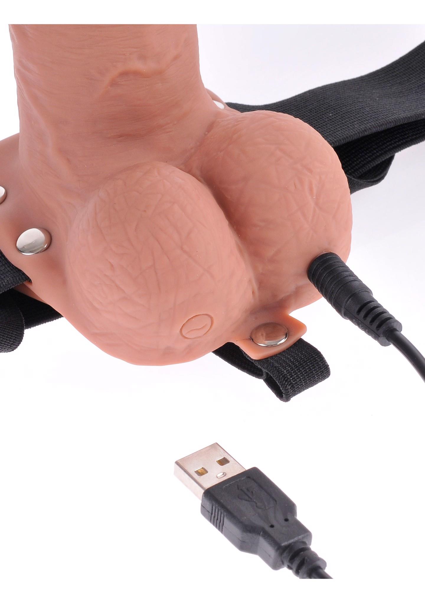 Have you always wanted to feel more confident about your size and enjoy satisfying sex with your partner long enough for both of you to reach orgasm? Your lover knows that size matters—and nothing can fulfill fantasies and please a partner like a confident man that knows what he’s doing! Now you can have the length and girth you’ve always dreamt of and be all the man you can be with the Fetish Fantasy Series 7” Hollow Rechargeable Strap-On with Balls. Say goodbye to embarrassing midway letdowns and say hello to a satisfying smile from your lover! The comfortable elastic harness easily adjusts to fit most sizes, while the 7′ lifelike dildo hits the right spot every time. It’s perfect for men with ED, premature ejaculation problems, or couples looking to add a little flair to their fun. Best of all, you can still enjoy hot, face-to-face sex and ensure that both of you get off together!The rechargeable hollow strap-on is ready to go when you are and you’ll never have to worry about changing batteries again. Press and hold the button on the left testicle for three seconds to power on, then press the button again to cycle through ten thrilling pulsation patterns. Powered by a long-lasting lithium-ion battery, the super strong Japanese motor delivers thrilling, multi-speed vibrations at the tip of the dildo—precisely where your partner wants them most. The dildo is body-safe, latex-free, and compatible with both water-based and silicone-based lubricants. Cleanup is a snap after the fun with Pipedream toy cleaner and warm water. The included USB charging cord works with most USB power sources.Comfortable elastic harnessLifelike dildoRechargeable