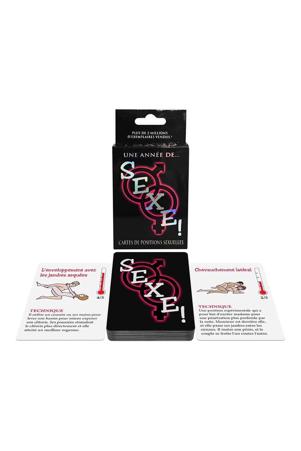 A Year of SEX! offers you over 50 different Kama Sutra positions. Use the cards as positional references or play one of the three SEX! games to build your fantasy. Each A Year of SEX! card offers a sex position illustration, technique instructions, and a challenge rating of 1-5, with 5 being the most intensely orgasmic. Includes new artwork to the packaging AND sex position cards. French language.Notre Sexe le plus vendu! Card Game est maintenant aussi en Français.