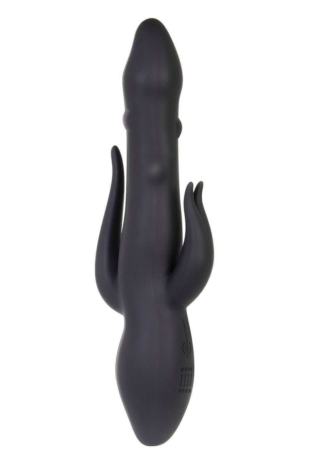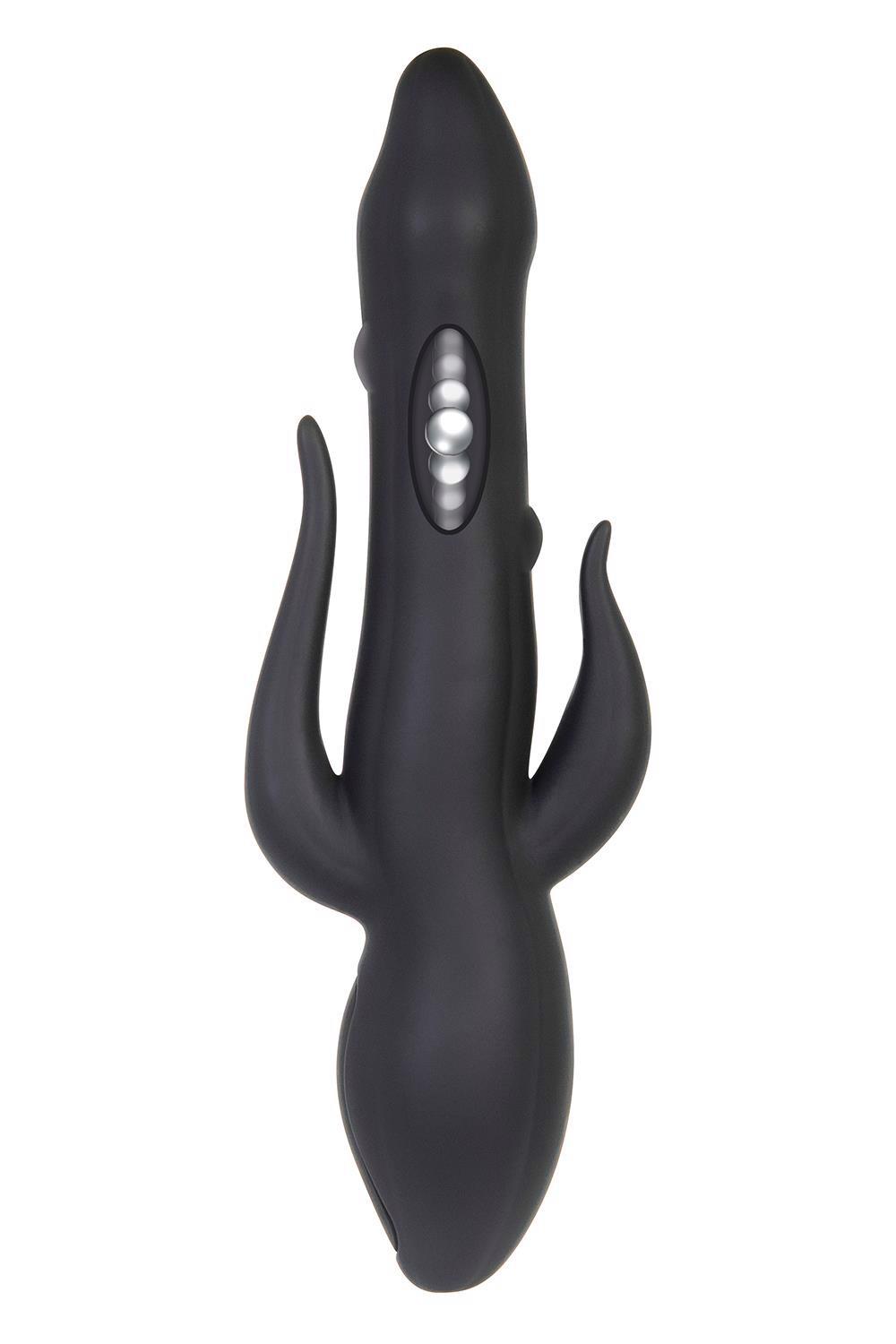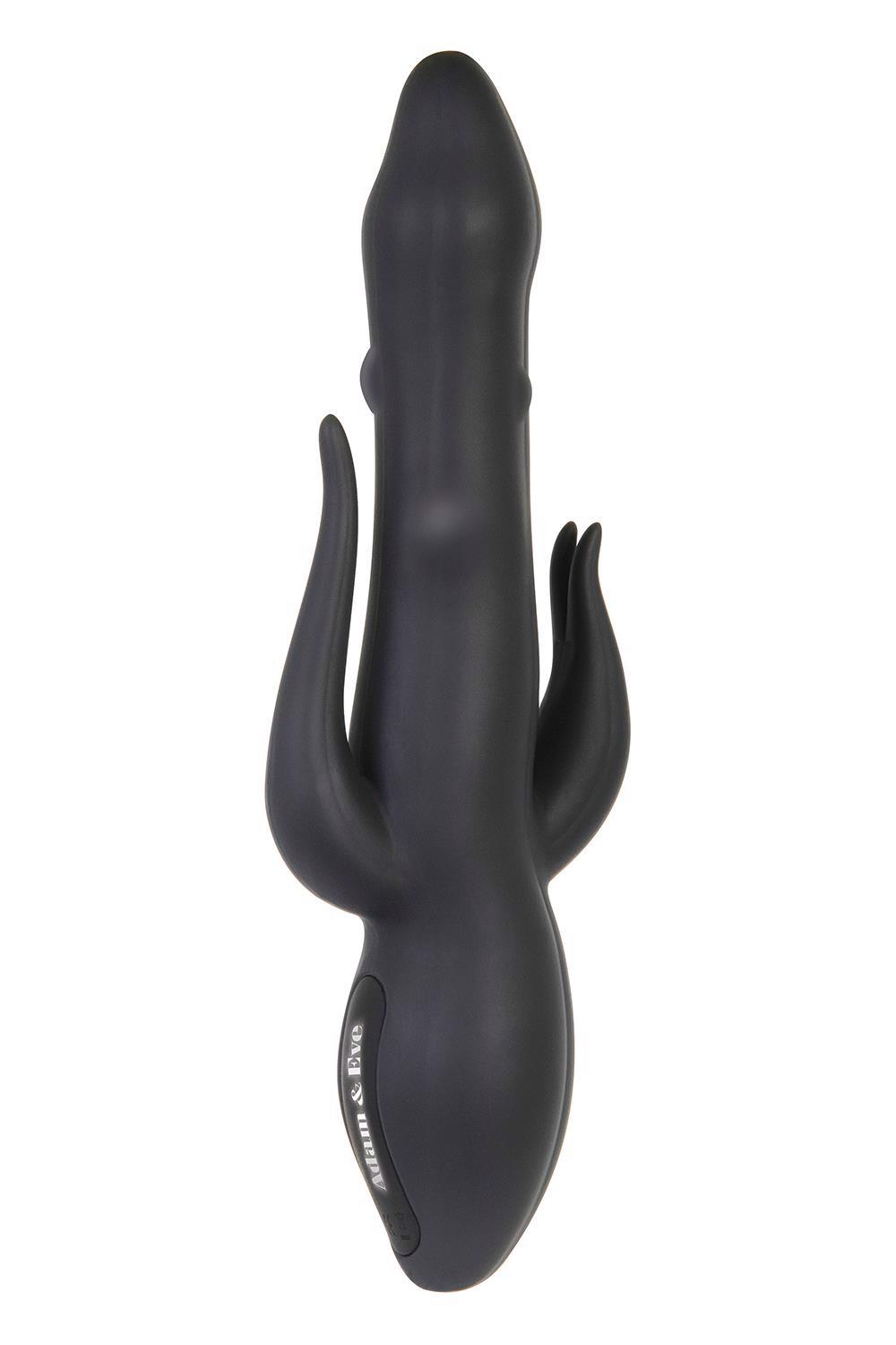 This triple threat toy delivers thrills in three of your major erogenous zones simultaneously! With two powerful motors in the shaft and clitoral stimulator, the anal tickler is designed to resonate the vibes just right so that you can experience a mind-blowing tri-gasm! As if that weren’t enough, the shaft features dancing beads that move up and down to mimic the real live thing, and they’ve got seven functions to experiment with so that you can tailor your trifecta win-win! Enjoy this toy in the bath or shower as it’s completely waterproof and submersible, and clean up easy with toy cleaner and a warm water rinse.Large triple stimulation rabbit vibe with anal ticklerPerfect for experiencing tri-gasmsStimulates three erogenous zones simultaneouslyClitoral and anal stimulators vibrate with 7 functionsDancing pearl beads inside the shaft move up and down with a 7 function motorBeads provide a life-like realistic penetration feelMade from luxurious siliconeShaft total length 24,1 cm insertable length 14 cm, 3,4 cm widthClitoral Stimulator: 5,1 cm lengthAnal Stimulator: 7 cm lengthPhthalate & latex freeWaterproof and submersibleFully rechargeable, USB cable included