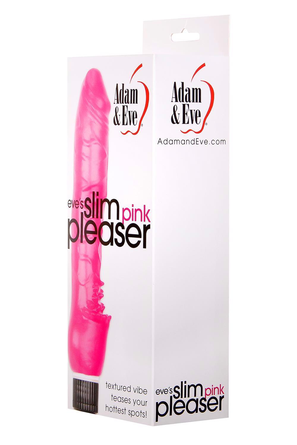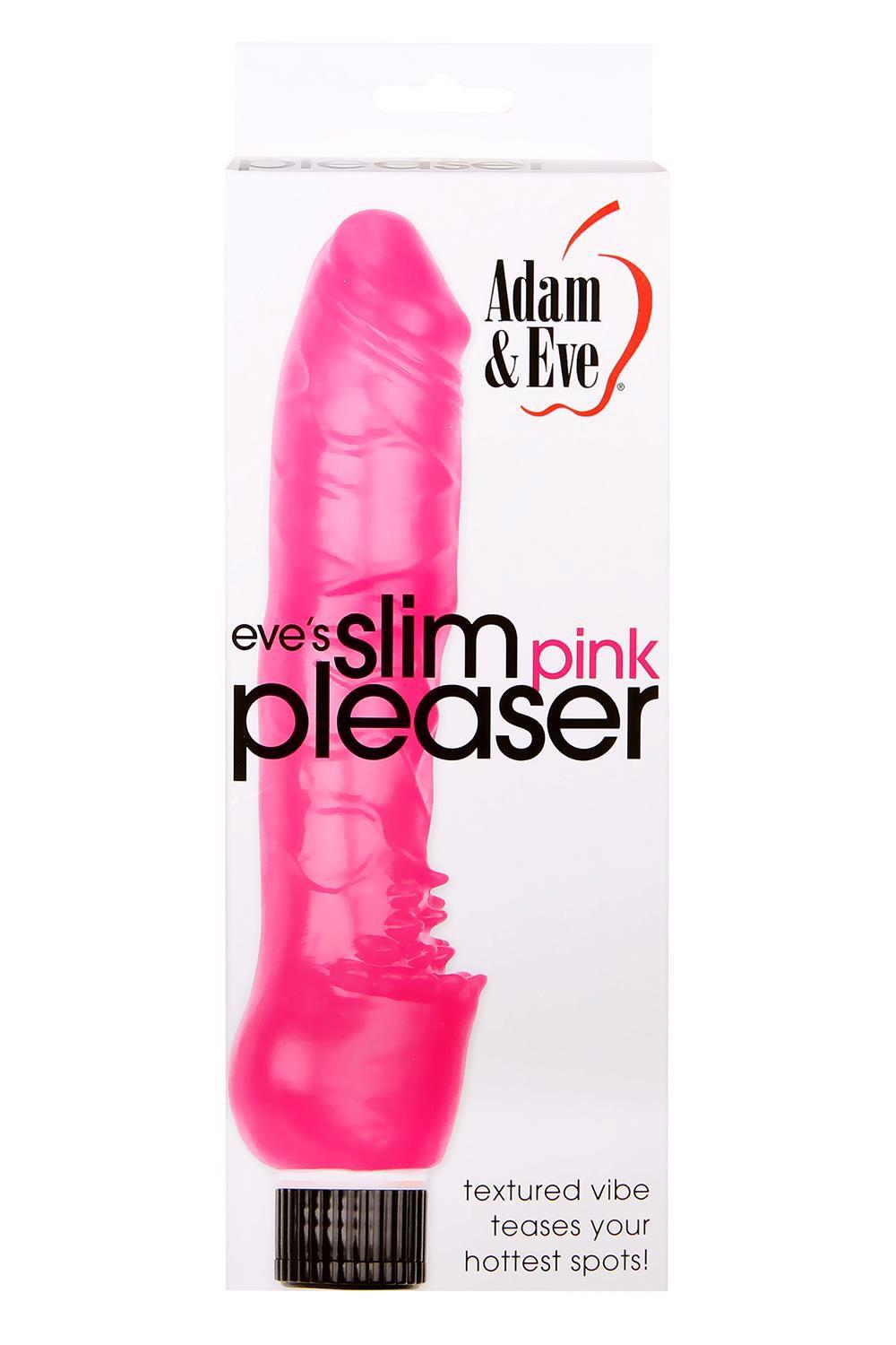 Think pink and think pleasure! Eve´s Slim Pink Pleaser slides in easily with a realistic tapered tip and rocks your world with multiple vibration speeds. Feel toe-curling sensations inside and out as you explore this vibes’s naughty textured shaft and nubby clitoral ticklers. The perfect size and shape for beginners and sexperts alike!Intensely textured shaftNubby clitoral ticklersMulti-speedWaterproofMade from body safe TPR7” long and 1” wideUses 2 AA batteries, not included