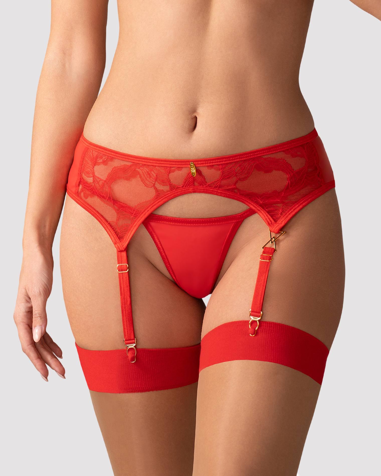 Pas do pończoch z gustowną koronką. Złote detale znakomicie komponują się z intensywnym odcieniem czerwieni. Haftki z tyłu oraz paski z możliwością regulacji gwarantują znakomite dopasowanie.