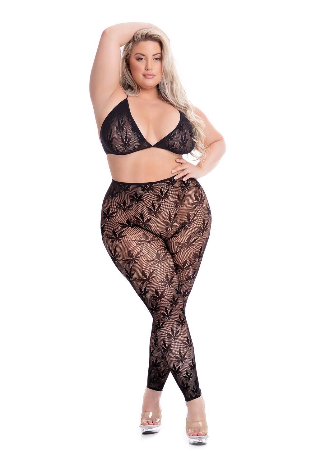 Set of bra and legging. Made of net fabric. Embroidery of hemp leaves. Handwash.A highly-seductive duo. This risqué All About Leaf Bra Set features a bra and footless leggings combo. What makes things truly sultry is the sheer net material that doesn’t leave much to the imagination. Highlighted by a unique pot leaf design, let your personality shine on those occasions where flowers and hearts just won’t do.You can wear it on its own and give your partner a visual treat, or tease them by pairing it with panties of your choice. However you choose to rock this set, you’ll look blazing hot!Comfortable and risqué net materialCheeky pot leaf designAdjustable triangle cups for the top and footless leggings comboClick here for the Pink Lipstick Size Chart Fabric care Hand wash in cold water Do not dry clean Do not bleach Line dry Do not iron