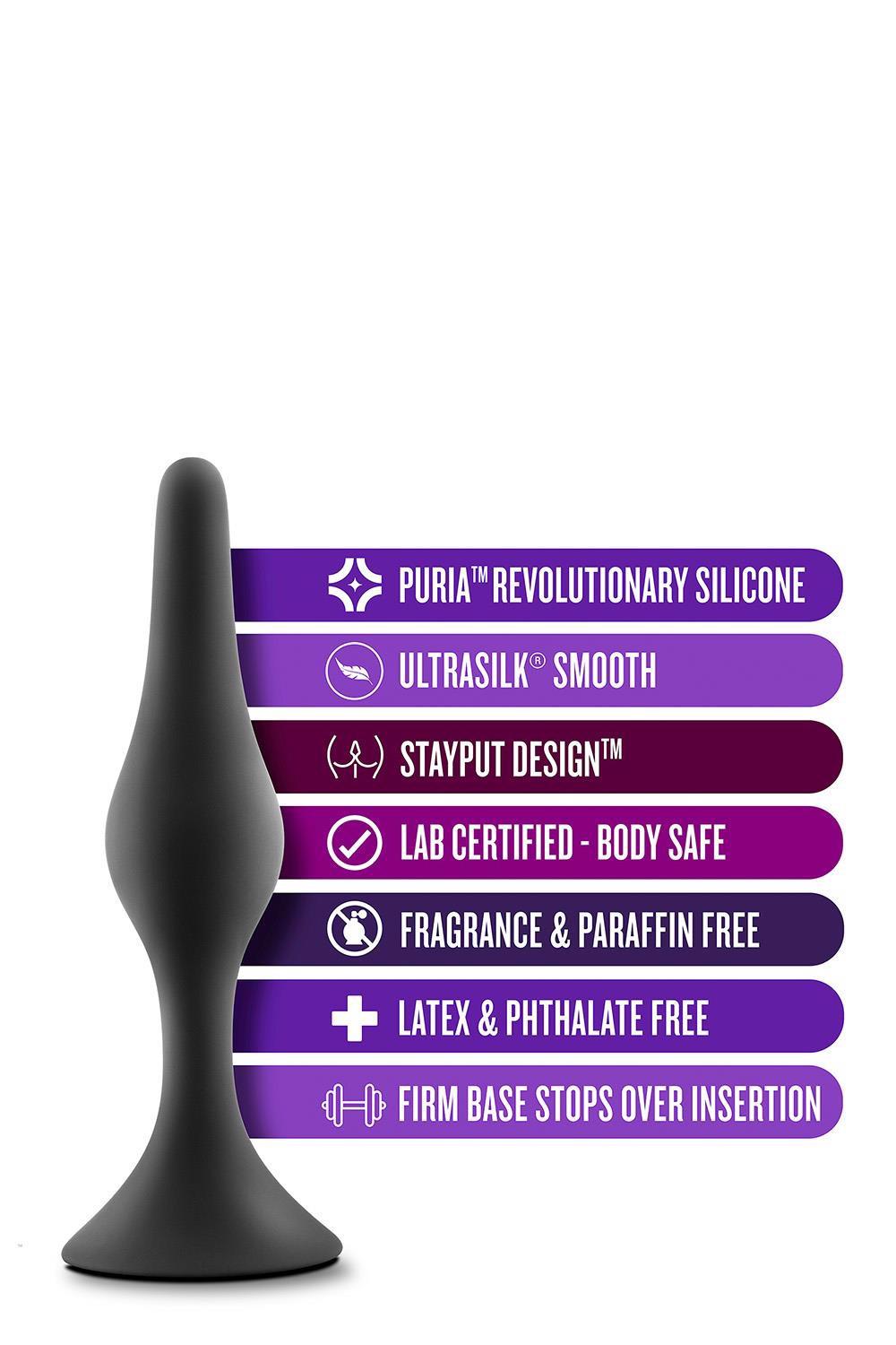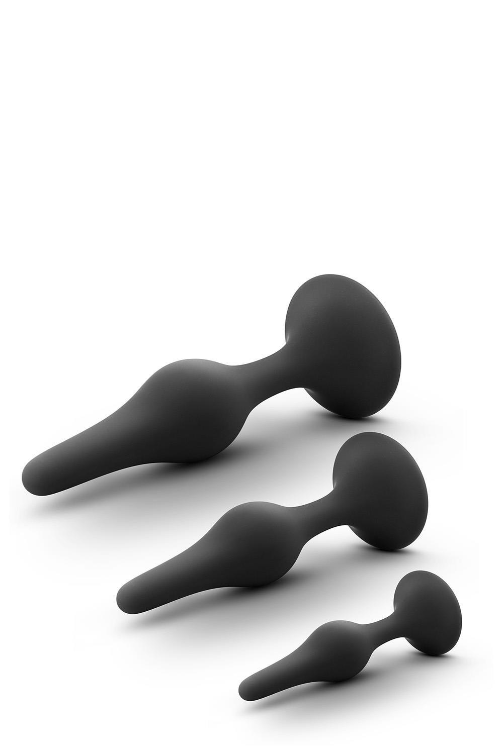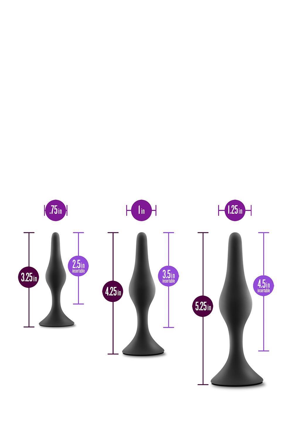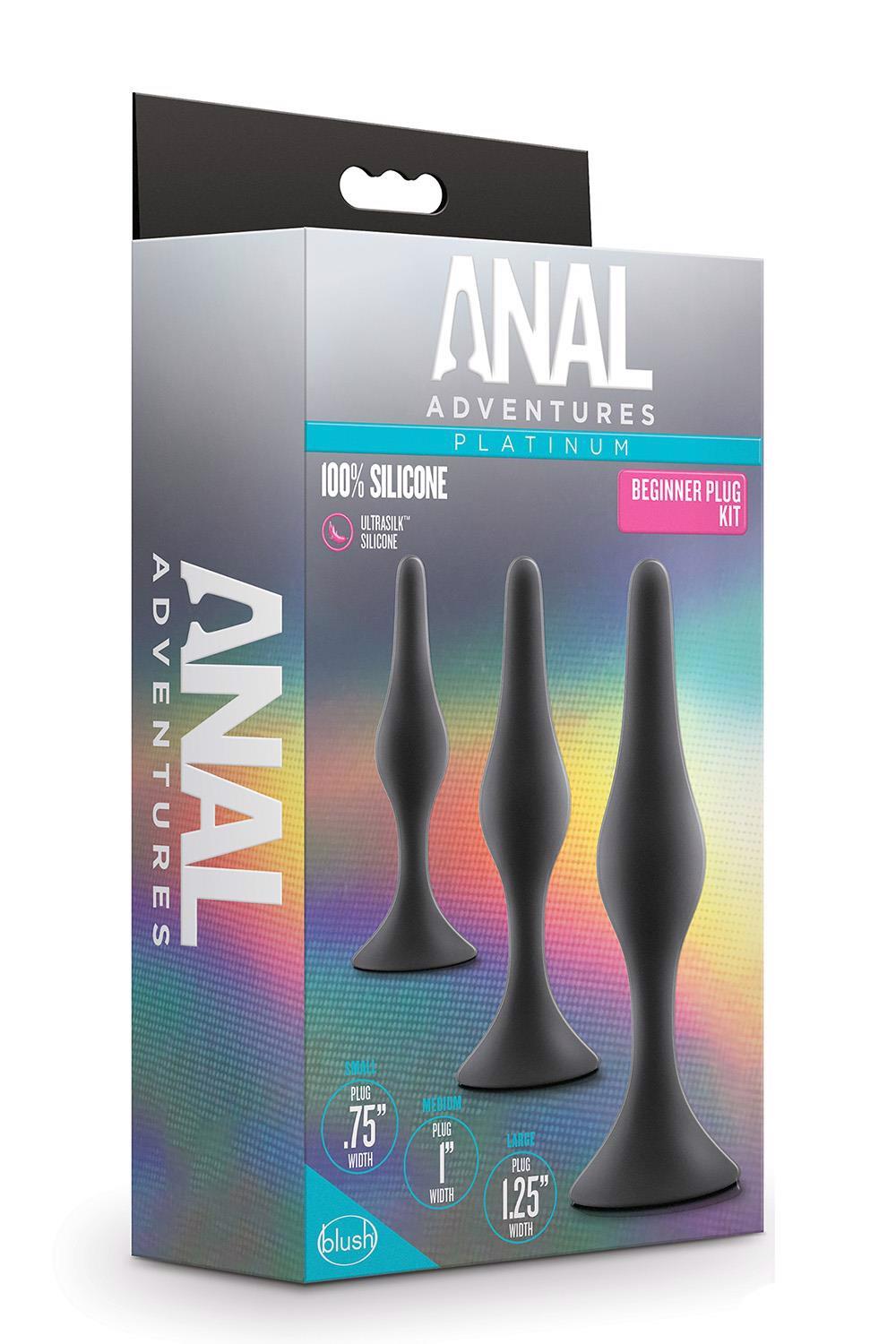 For anyone looking to explore new anal sensations alone or with a partner! Anal Adventures provides many options to choose from. The Silicone Beginner Plug Kit features three plugs in progressing sizes for beginner anal training! They are tapered for comfortable and secure insertion. They are made with StayPut™ technology, ensuring that once the plug is inserted in the body, it won’t pop out! UltraSilk® smooth and made of Puria™ platinum-cured silicone, these plugs are body-safe, phthalate free, fragrance free, latex free, and easy to clean.Pure Platinum Cured Puria™ Silicone. Ultrasilk® Smooth. Water based, hybrid lube safeThree graduating sizes to train comfortablyStayput™ design keeps product securely in placeSoft, flexible shaft moves with your bodyDimensions:Large: length 5.25 inch x width 1.25 inch / 13,3 x 3,1 cmMedium: length 4.25 inch x width 1 inch / 10,7 x 2,5 cmSmall: length 3.25 inch x width 0.75 inch / 8,2 x 1,9 cm