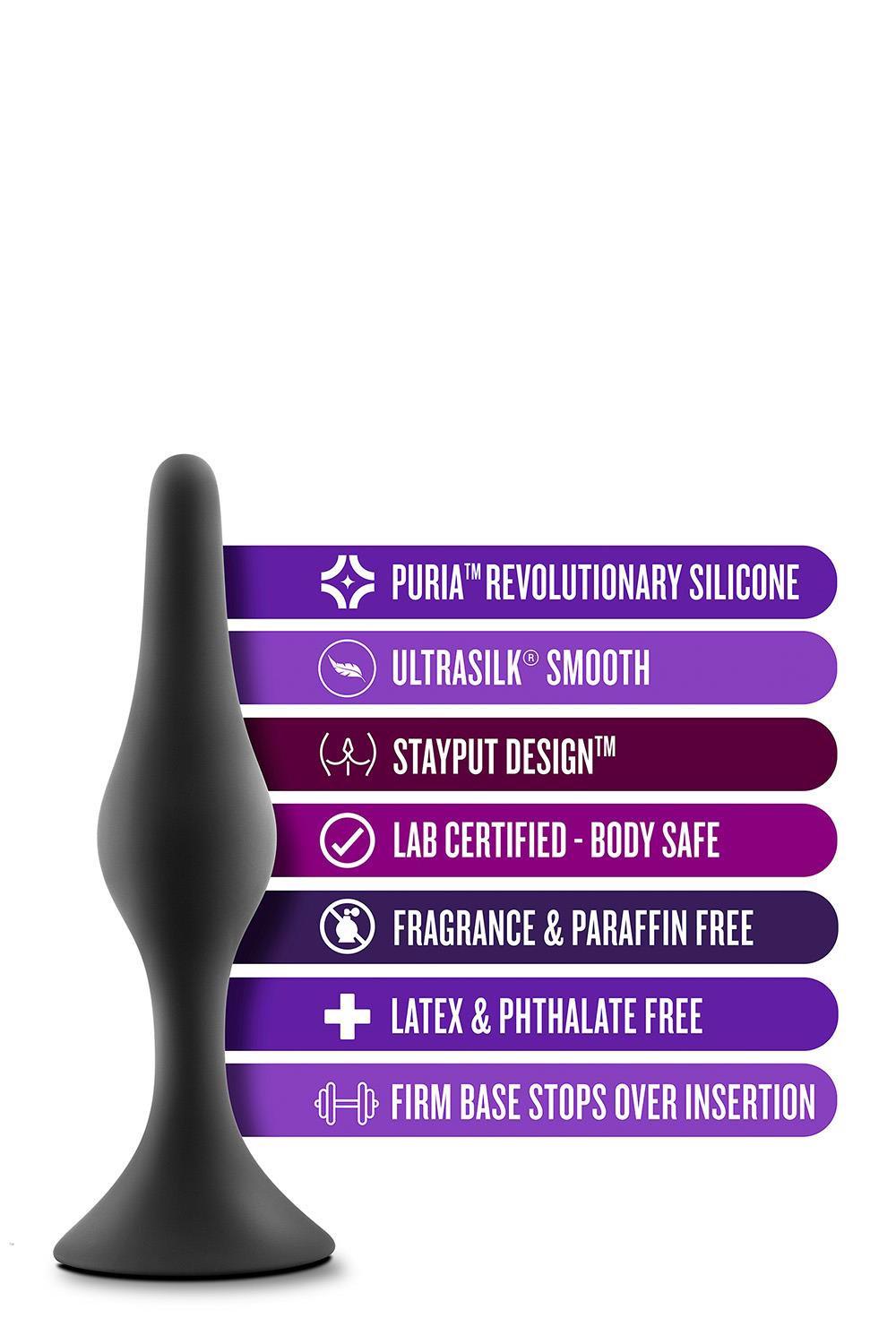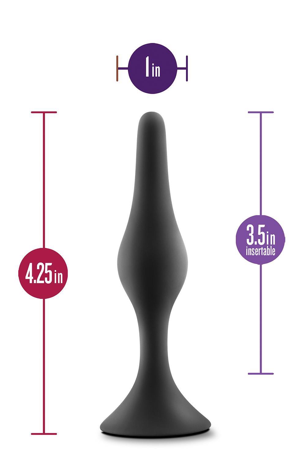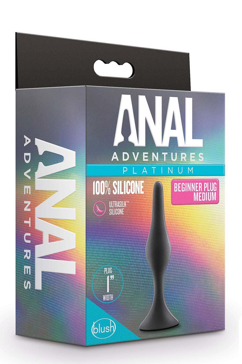 For anyone looking to explore new anal sensations alone or with a partner! Anal Adventures provides many options to choose from. The Silicone Beginner Plug Medium features the perfect plug for beginner anal training and seasoned players alike! It is tapered for comfortable and secure insertion and is flexible so it moves with your body during use. This plug is made with StayPut™ technology, ensuring that once the plug is inserted in the body, it won’t pop out! UltraSilk® smooth and made of Puria™ platinum-cured silicone, it is body-safe, phthalate free, fragrance free, latex free, and easy to clean.Pure Platinum Cured Puria™ Silicone. Ultrasilk® SmoothStayput™ design keeps product securely in placeSoft, flexible shaft moves with your bodyShaped for comfortable insertionLength 4.25 inch / 10,8 cmInsertable length 3.5 inch / 8,9 cmWidth 1 inch / 2,5 cm