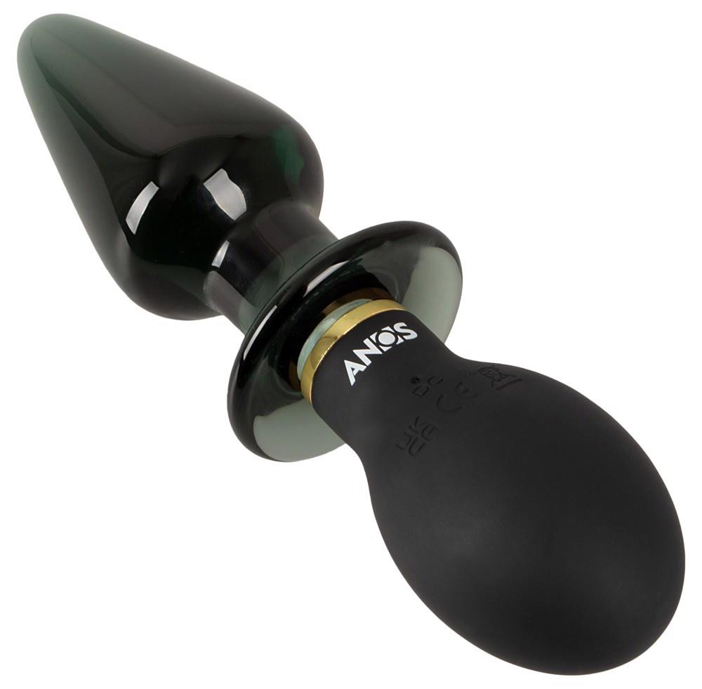 The beautifully shaped Double-ended Butt Plug with Vibration by ANOS is made of a high-quality mix of materials that combines all the advantages of a silicone and a glass vibrating plug. Can be played with anally on both sides: one side with a rounded silky soft silicone plug, the other side with a solid, smooth glass plug and subtle LED lighting in the sensual tip. The tapered centre has a wide stopper that safely prevents the plugs from slipping in.