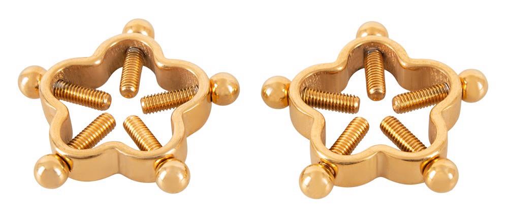 Te dwa lekkie jak piórko zaciski na sutki Nipple Jewellery Golden Flower marki Bad Kitty utrzymują sutki w zmysłowo delikatnym do ekscytująco mocnego uścisku dzięki 5 śrubom regulacyjnym każdy. Dzięki stylowo prostemu wzornictwu w kształcie kwiatu, metalowe zaciski w kolorze złota wyglądają bardzo elegancko i dopełniają iluzji prawdziwego piercingu.