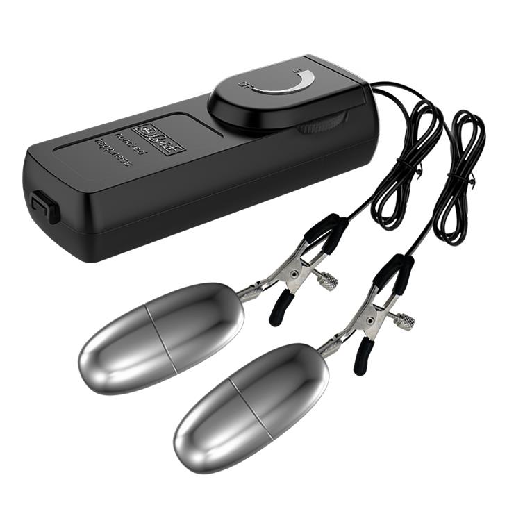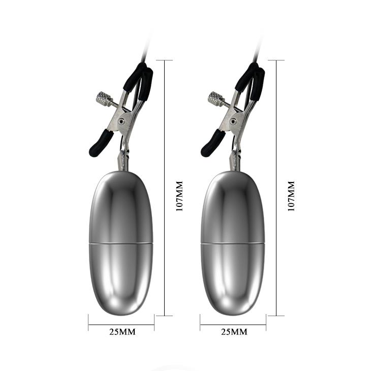 Metalowe lekkie klipsy z gumowymi końcówkami, na których zawieszone są wibrujące jajeczka.