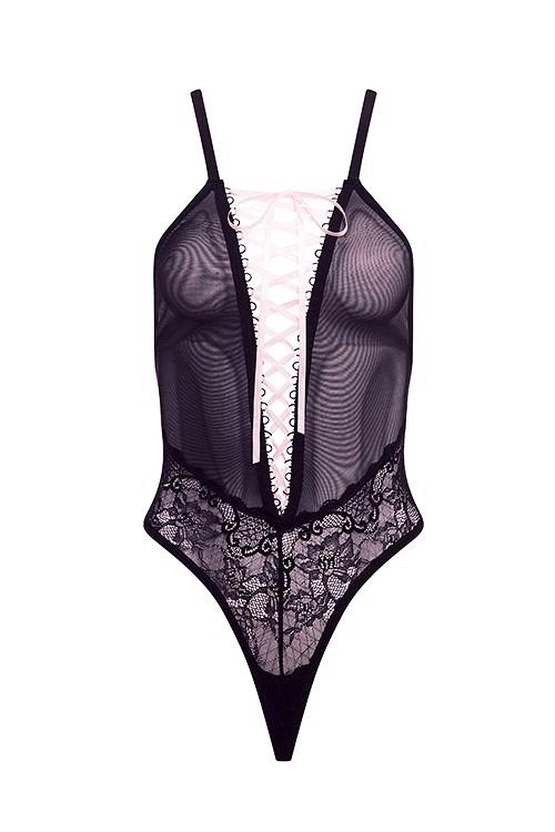 Eye catching pink satin ribbon joins the plunging cleaved black mesh top in this body-hugging that finishes high at the hip, diving effortlessly into a V-shaped panty. A classic profile accentuates the breasts and hips with detail that polishes the look.A gift from Barely Bare The lingerie is packed in a stylish black box with a card at the front that can be removed to turn the box into a nice gift box. In addition it comes with a removable black and red elastic leg garter that is adorned with a heart shaped jewel and a bow, which is a lovely way to make the gift box complete! A gift and USP from Barely Bare for all online and offline retailers and an eye catcher in any store.Mesh and lace lace-up teddyOne size fits mostBody-hugging stretchy lace & meshPink satin lacesNo underwireAdjustable strapsHand wash