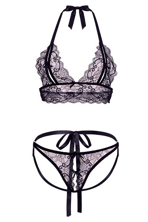 Beautifully scalloped dramatic lace creates the peek-a-boo cups and plunging neckline on this bra and panty set, letting the detail do all the talking. Black ribbons frame the exposed derriere with a bow at the low back that beckons to be untied, anchored by a bikini panty bottom.A gift from Barely Bare The lingerie is packed in a stylish black box with a card at the front that can be removed to turn the box into a nice gift box. In addition it comes with a removable black and red elastic leg garter that is adorned with a heart shaped jewel and a bow, which is a lovely way to make the gift box complete! A gift and USP from Barely Bare for all online and offline retailers and an eye catcher in any store.Peek-a-boo bra & panty set.Lace bra with peek-a-boo slits. Strappy peek-a-boo panty. Frames the derriere. One size fits most. No underwire. Open back. Adjustable straps. Adjustable neck straps. Hand wash.
