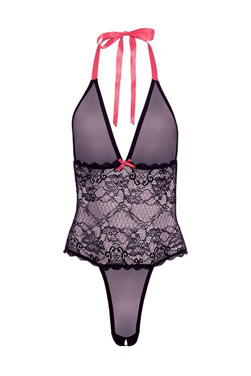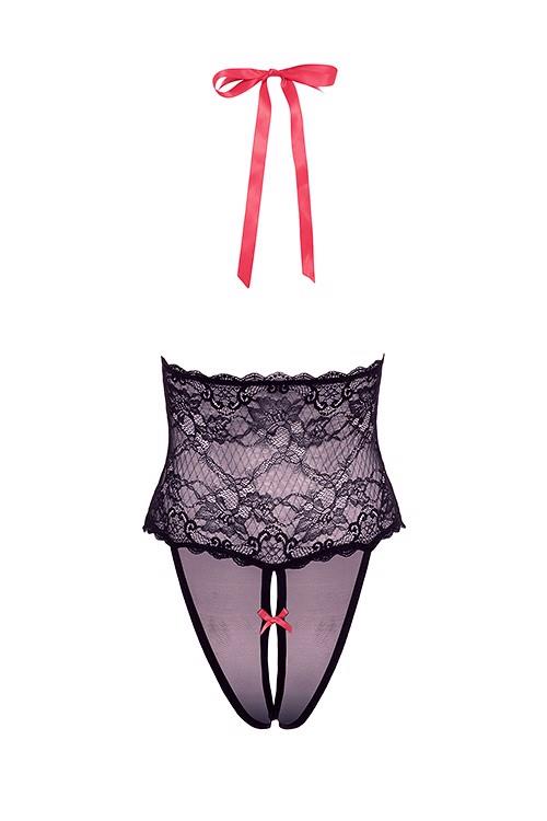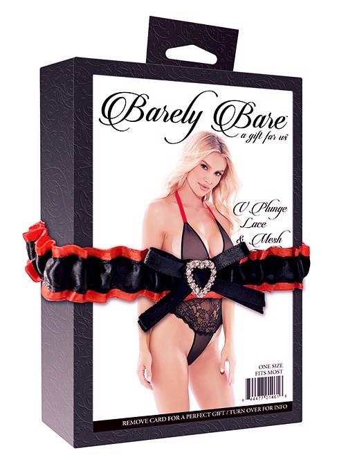Mesh meets black lace in this plunging V teddy that seamlessly blends a delicate lace bustier with a feather-light mesh halter and panties. Exquisitely body-hugging for a boudoir look, vibrant red accents draw the eye between the cups and up to the neck where the key to its undoing lies nestled under the hair.A gift from Barely Bare The lingerie is packed in a stylish black box with a card at the front that can be removed to turn the box into a nice gift box. In addition it comes with a removable black and red elastic leg garter that is adorned with a heart shaped jewel and a bow, which is a lovely way to make the gift box complete! A gift and USP from Barely Bare for all online and offline retailers and an eye catcher in any store.Teddy with plunging V necklineMesh top & bottom with lace bodiceOne size fits mostBody-hugging stretchy lace & meshHalter style adjustable tie at neckVibrant red detailNo underwireHand wash