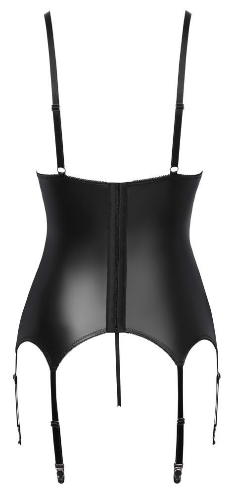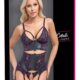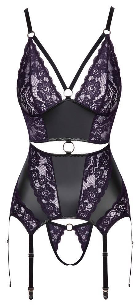 Top do pończoch i stringi bez krocza od Cottelli LINGERIE. W czarnym matowym kolorze, z koronkowymi wstawkami w wyrafinowanym ciemnofioletowym kolorze z przodu. Miękki i elastyczny dla pełnego komfortu. Z ozdobnymi elastycznymi ramiączkami i pierścieniem między miękkimi koronkowymi miseczkami. W wycięciu z przodu w talii i w pasie ze sznurkiem znajduje się również srebrny pierścień. Ramiączka i łącznie 6 szelek są regulowane. Podobnie jak podwójne zapięcie na haftki z tyłu. Mały sznurek jest uwodzicielsko otwarty w kroku.
