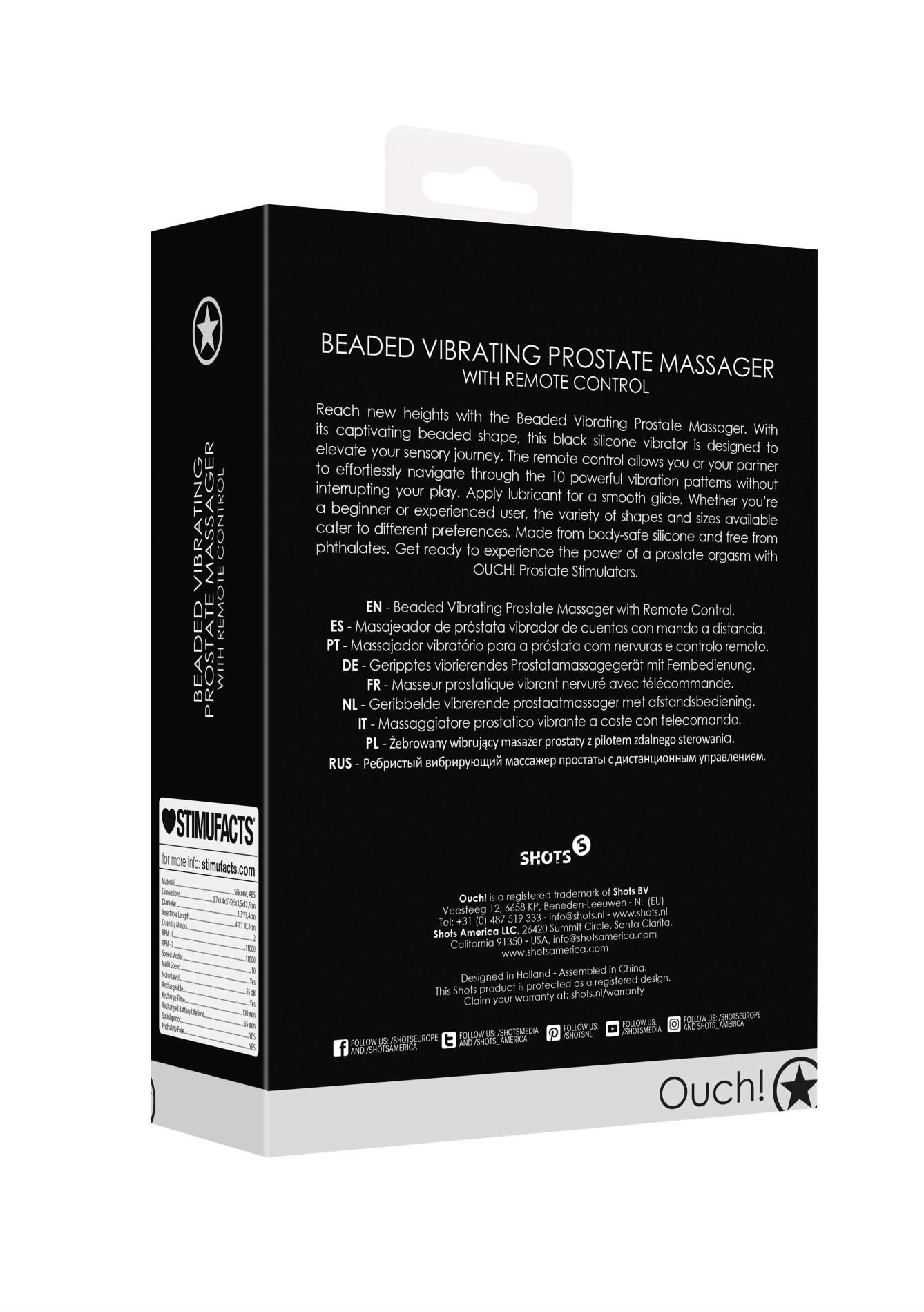 Osiągnij nowy poziom z wibrującym masażerem prostaty. Dzięki urzekającemu żebrowanemu kształtowi, ten czarny silikonowy wibrator został zaprojektowany, aby przenieść Twoje doznania zmysłowe na nowy poziom. Pilot zdalnego sterowania pozwala Tobie lub Twojemu partnerowi bez wysiłku poruszać się po 10 potężnych wzorach wibracji bez przerywania zabawy. Nałóż lubrykant, aby uzyskać gładki poślizg. Niezależnie od tego, czy jesteś początkującym, czy doświadczonym użytkownikiem, różnorodność dostępnych kształtów i rozmiarów zaspokaja różne preferencje. Wykonany z bezpiecznego dla ciała silikonu i wolny od ftalanów. Przygotuj się na moc orgazmu prostaty z OUCH! Prostate Stimulators.