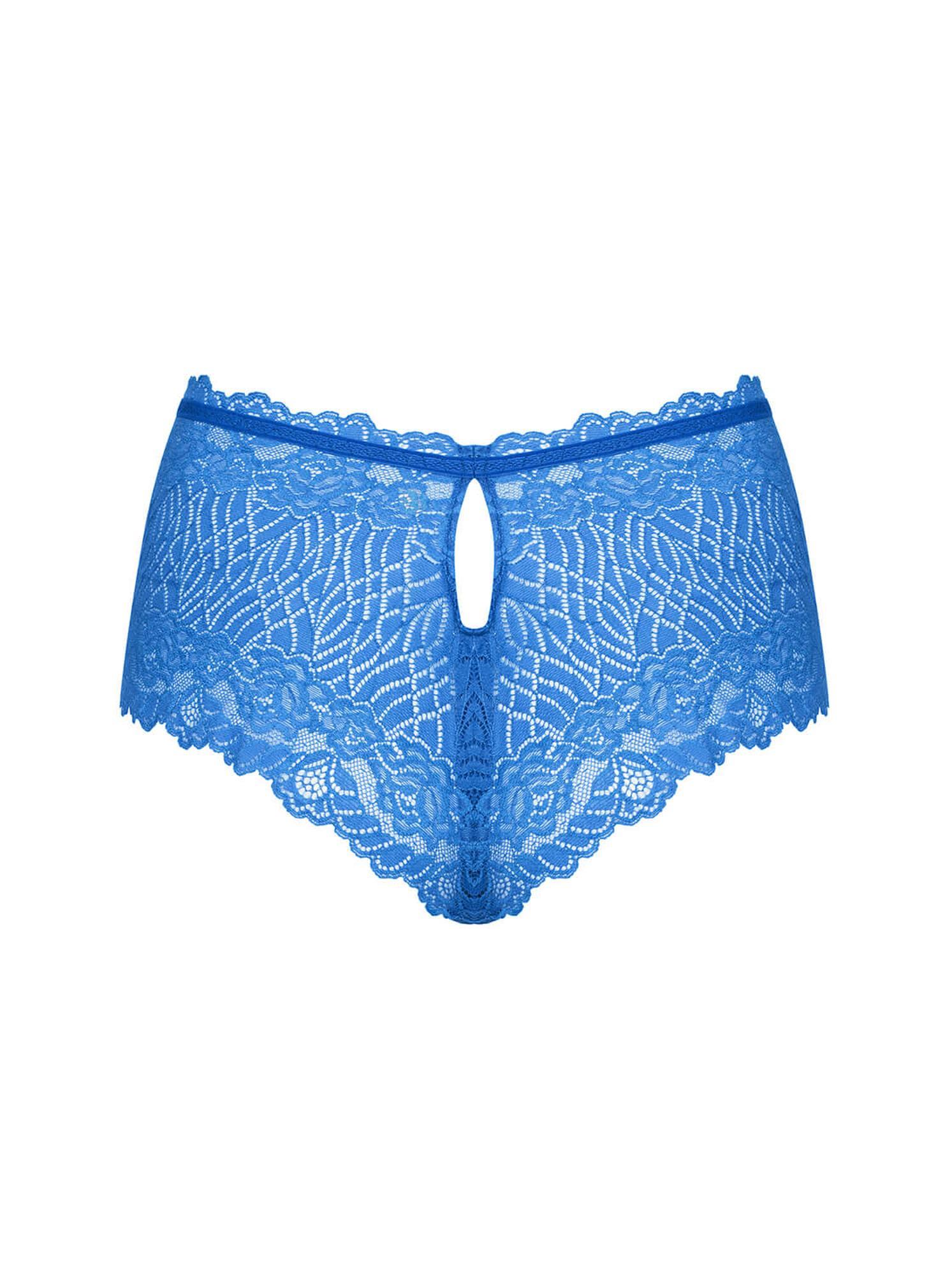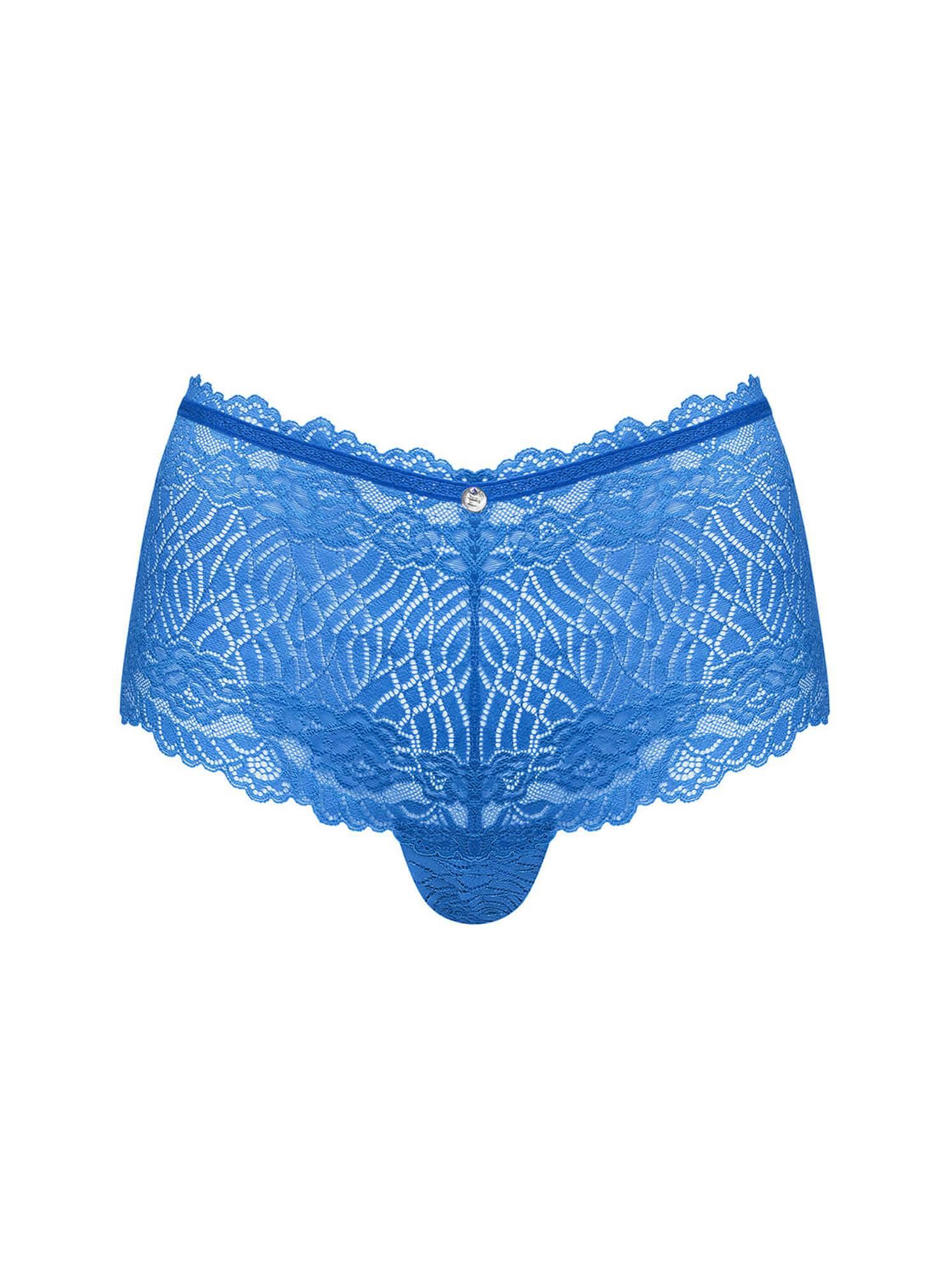 Fantazyjna koronka, pełen wdzięku błękit, wycięcie nad pośladkami, zjawiskowo błyszcząca ozdoba i uroczy, kobiecy fason! Jak można się temu wszystkiemu oprzeć? Dodajmy do tego prześwitujący wzór – już wiesz, że nie można. Przed Tobą długie i gorące noce, a miłosnych uniesień czeka Cię jeszcze więcej.
