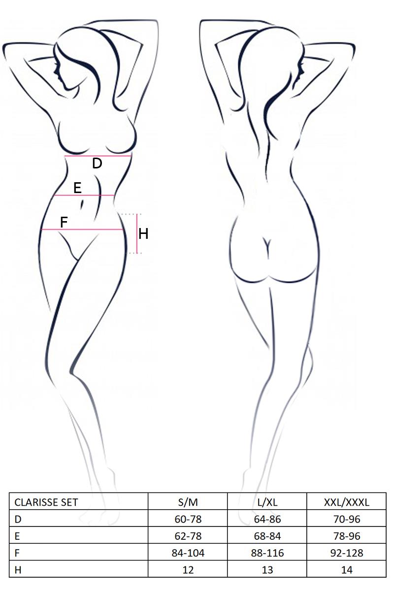 Czy czarny Clarisse set może być klasyczny? Tak, jeśli mówimy o elegancji. Ale czy jednocześnie może być wyzywający i nieprzyzwoicie seksowny? Oczywiście! Biustonosz typu „open bra”, czyli z otwartą częścią biustonosza wzmocniony fiszbinami uwydatnia piersi i podkreśla kobiecy dekolt, z kolei pas i majtki podkreślają kobiecą talię uwypuklając najważniejsze walory kobiecego ciała. Obok takiego kompletu niemożliwym staje się przejść obok niego obojętnie.