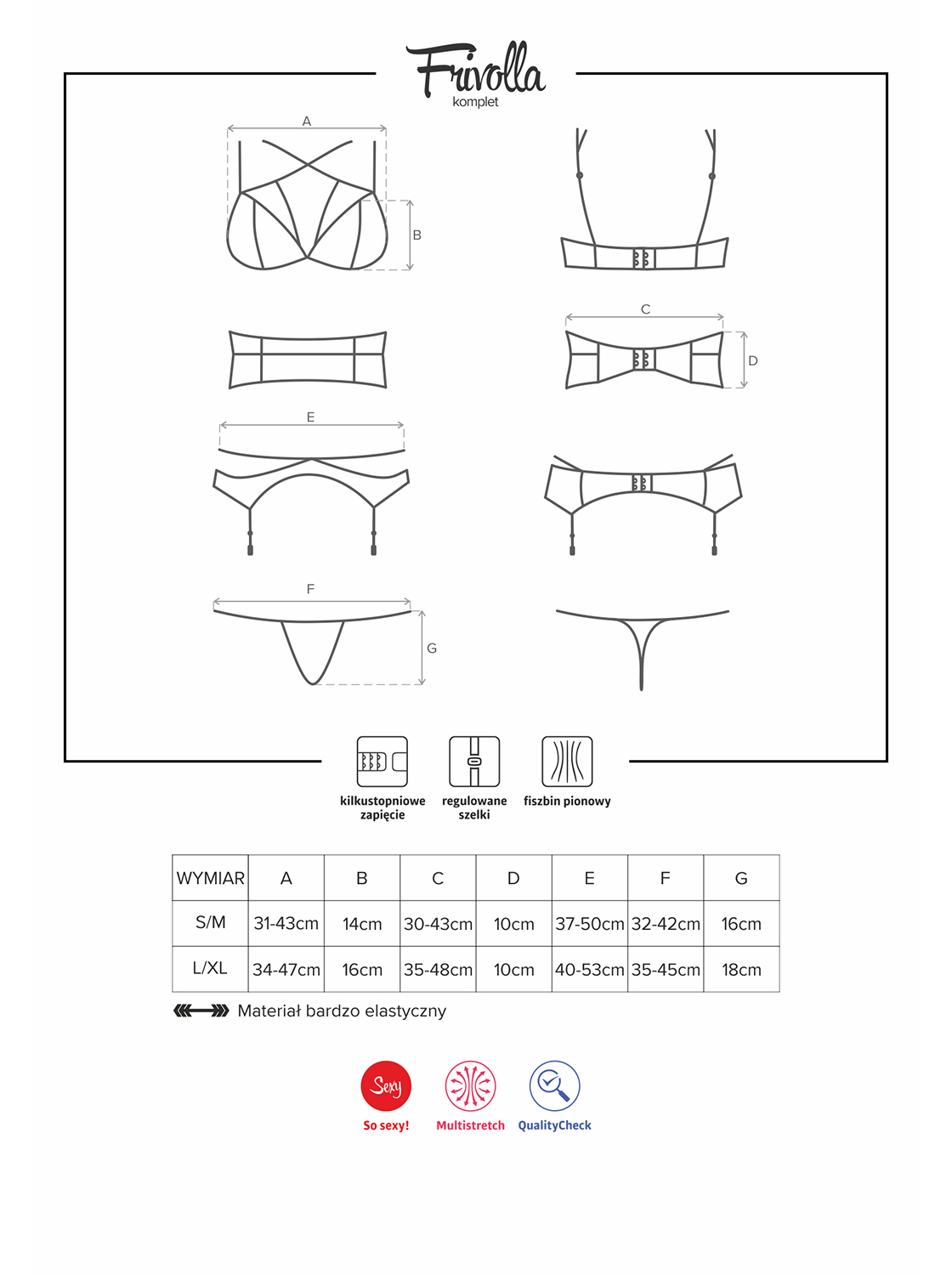 Obłędnie zachwycający i uwodzicielski. Oplecie Twoje ciało cudownie delikatną koronką i figlarnymi paseczkami – od dekoltu aż po pośladki. Poznaj komplet Frivolla! Każdy z czterech elementów pozwoli Ci zrobić prawdziwą furorę. Odkryj niezwykłe działanie koronkowego pasa. Kusząco ozdobi talię i doda kokieteryjnego wdzięku. Będzie idealnie! Poznaj wyjątkowy zestaw: – niesamowity, 4-częściowy komplet – delikatny, koronkowy biustonosz – subtelnie podkreślone krągłości – kilkustopniowe zapięcie i regulowane ramiączka w biustonoszu – rewelacyjne dopasowanie – imponująca kombinacja gumeczek na dekolcie – koronkowy pas z pionowymi fiszbinami i kilkustopniowym zapięciem – seksownie wyeksponowana talia! – regulowany pas do pończoch z zalotnym paseczkiem wokół bioder – w komplecie koronkowe stringi – miły w dotyku, elastyczny materiał (90% poliamid, 10% elastan)