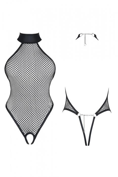 Seksowne body z podwyższoną stójką przy szyi. W całości wykonane z czarnej siateczki obwiedzioną czarną ekoskórą. Z tyłu zapięcia na szyi i plecach wykonane z metalowego, srebrnego łańcuszka, z zapinkami typu łezka. Body z otwartym dołem.