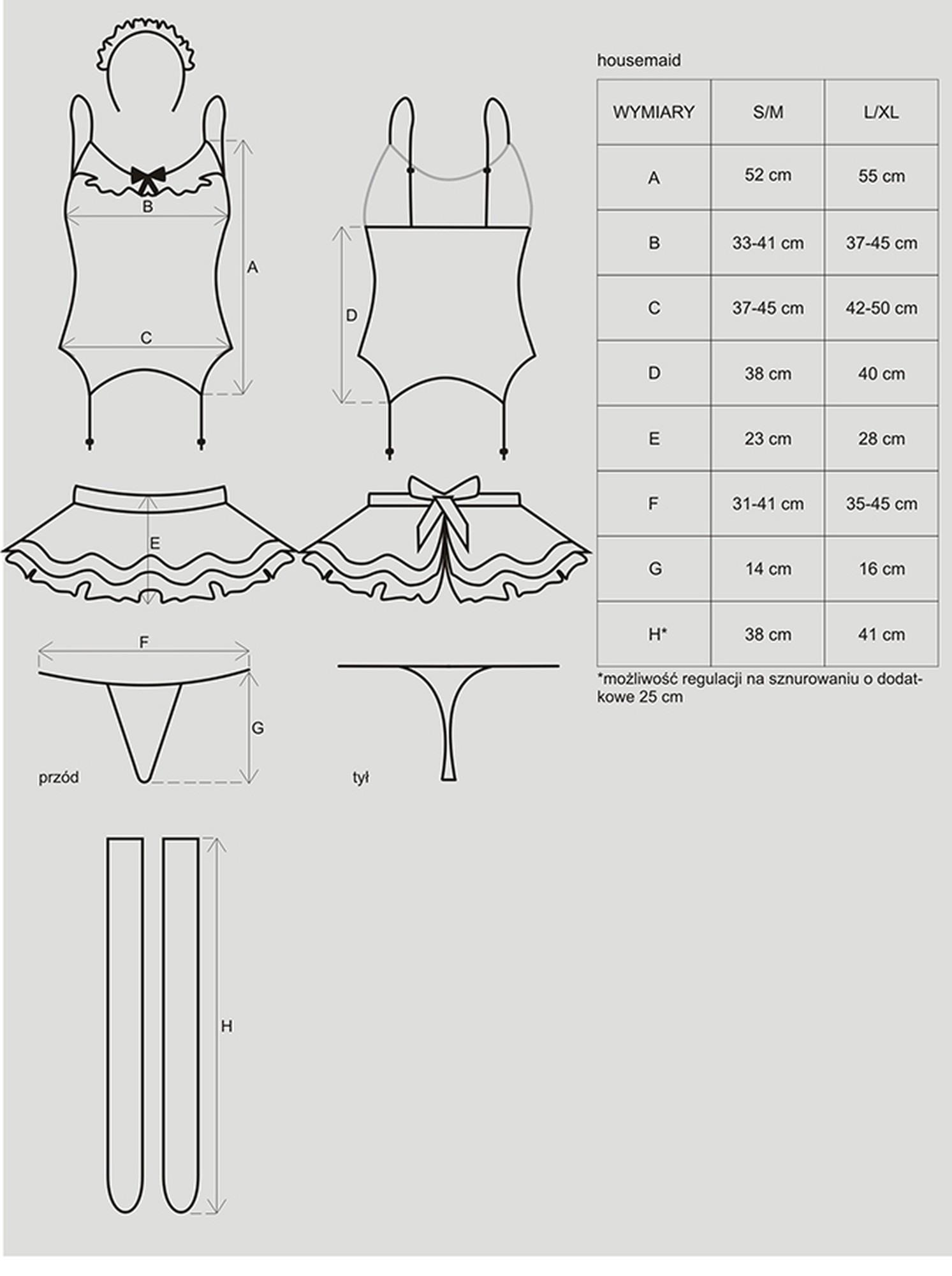 – przyjemnym, elastyczny materiał spódniczka, gorset, stringi, opaska: 90% poliamid, 10% elastan pończochy: 80% nylon, 20% elastan