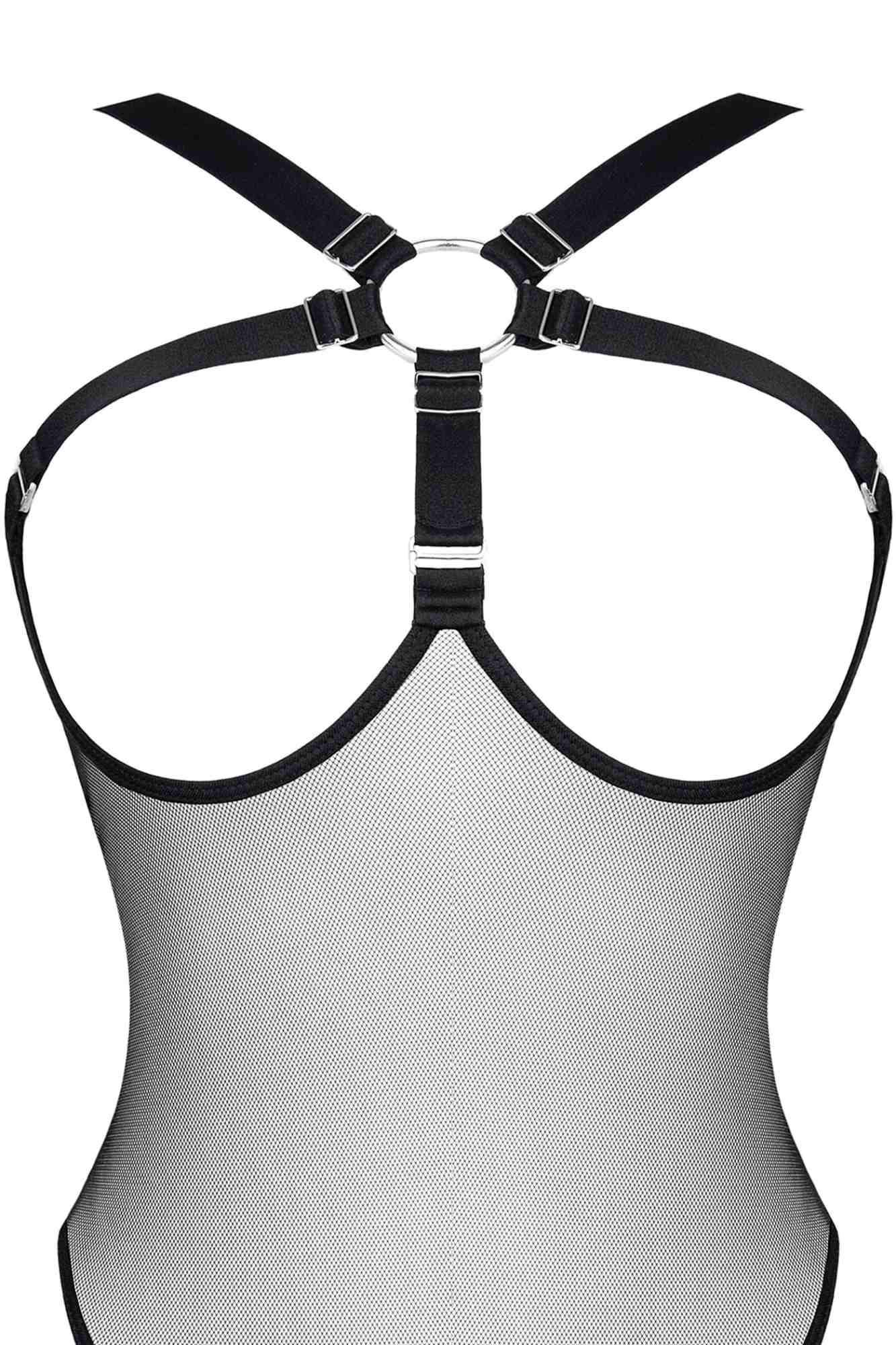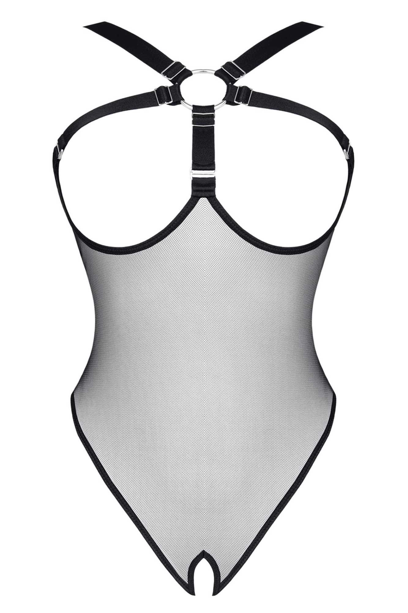 Body z miłej w dotyku, elastycznej, transparentnej siateczki. Z przodu przykuwająca uwagę kompozycja z czarnych gumek, połączonych ze srebrnym metalowym kołkiem oraz ozdobnymi regulatorami. Gumki miłe w dotyku z metalicznym połyskiem. Wysoko profilowane wycięcie na biodrach seksownie podkreśla linię pośladków i bioder. Dzięki licznym regulatorom, komplet można idealnie dopasować do ciała. Rozwiązanie typu open bottom umili czas pikantnych zabaw. Pudełko spersonalizowane ze zdjęciami produktu.