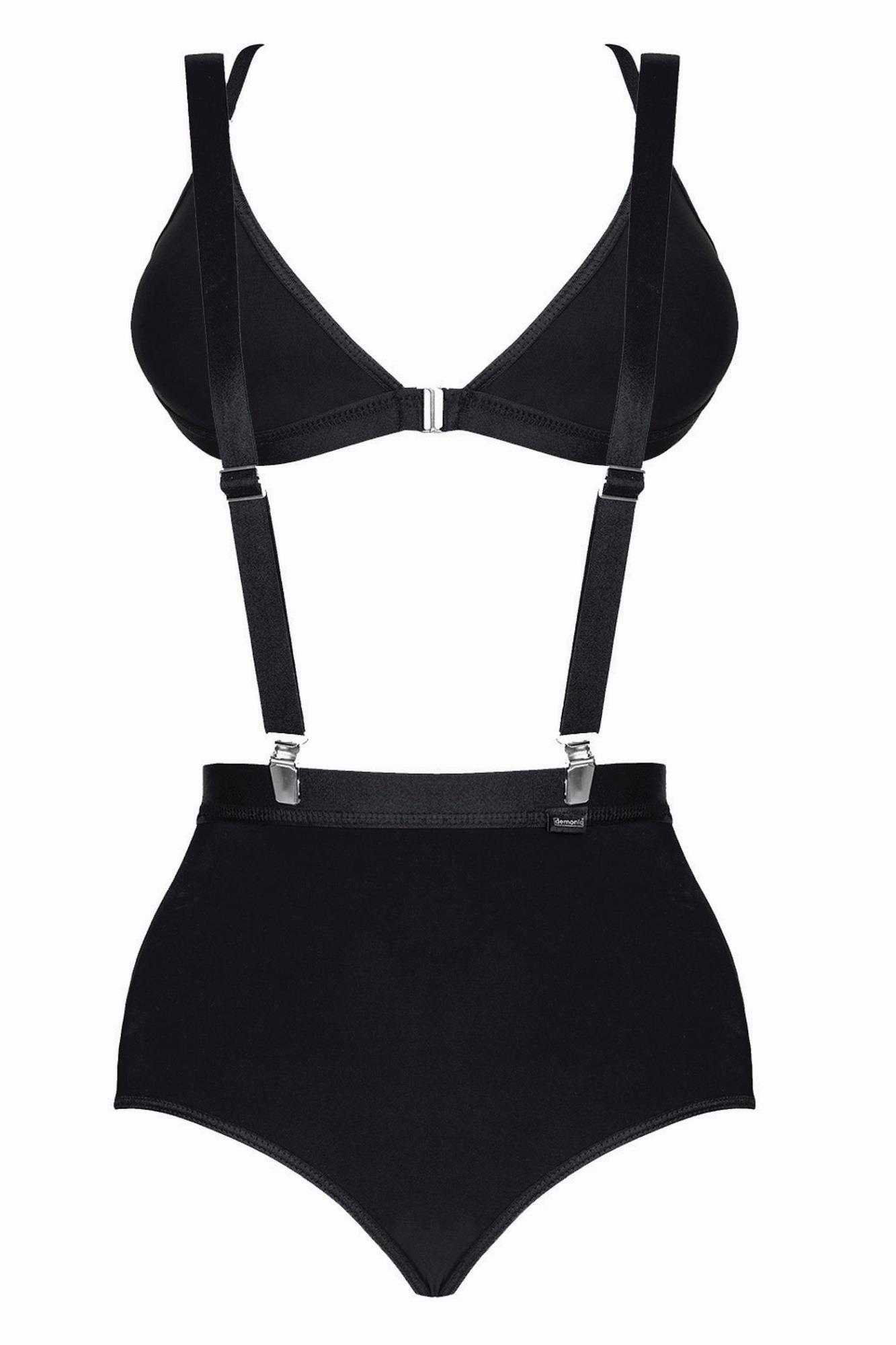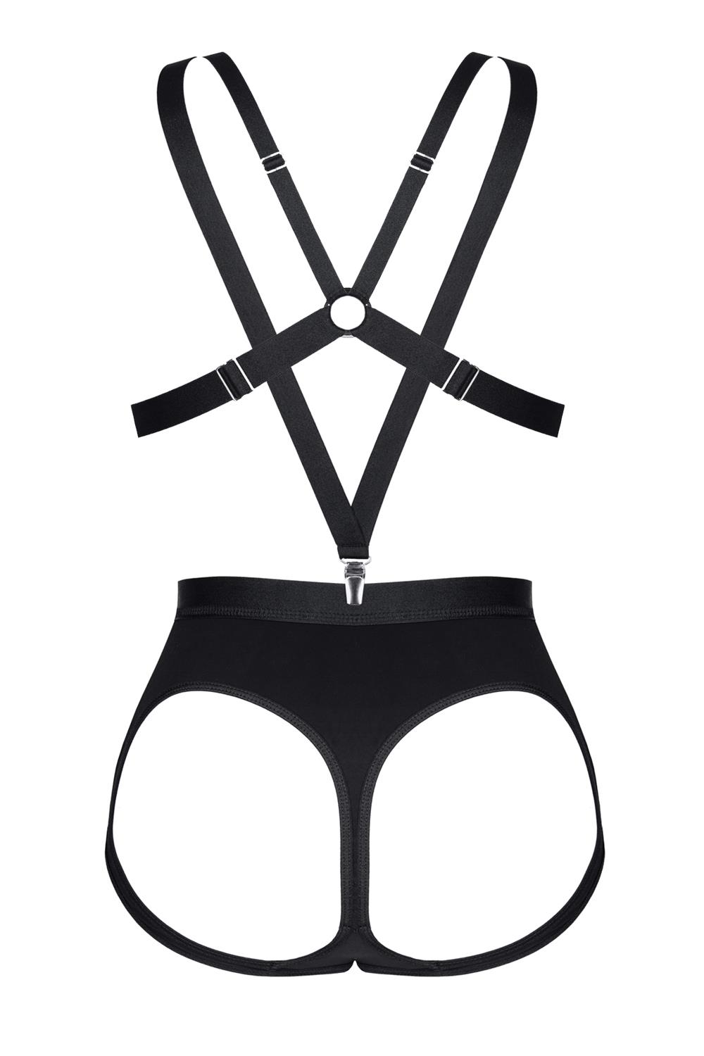 Komplet z przyjemnego w dotyku i elastycznego materiału w kolorze czarnym. Miłe w dotyku, wytrzymałe gumki. Biustonosz z przodu: srebrne, metalowe, ozdobne zapięcie, miseczki z czarnego, elastycznego materiału. Z tyłu ozdobna kompozycja z gumek. Szorty z odkrytymi pośladkami, idealnie uwydatniające seksowne krągłości. Szelki z metalowymi regulatorami i zapinkami w kolorze srebrnym. Pudełko spersonalizowane ze zdjęciami produktu.