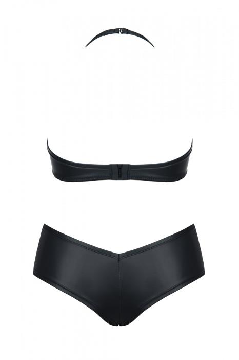 Szorty będące w komplecie wyróżniają się z przodu seksownym wcięciem w kształcie trójkąta obwiedzionego czarną, lakierowaną tasiemką. Z tyłu efektownie podkreślają kształt pośladków.