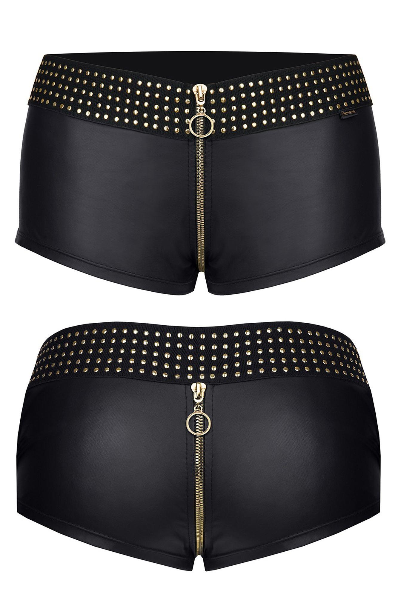 Ekscytująco zmysłowe szorty ze złotym zamkiem błyskawicznym. Wykonane z materiału typu wetlook, który jest wytrzymały i elastyczny. Dzięki temu szorty cudownie dopasowują się do ciała, zmysłowo podkreślając jego kształt. Z tyłu są tak wyprofilowane, aby jak najseksowniej uwypuklić krągłości pośladków. W górnej części znajduje się szeroka, czarna gumka z ozdobnymi aplikacjami w kształcie drobnych, złotych kółek.