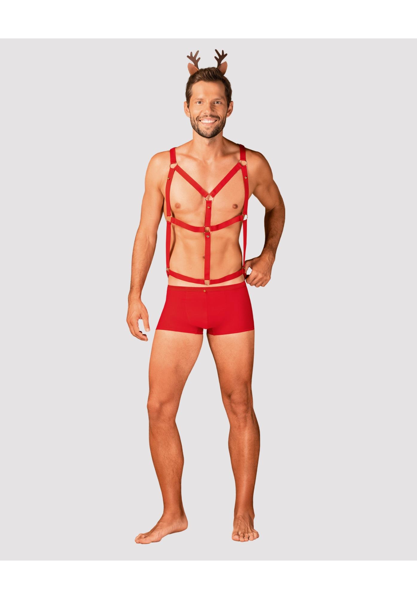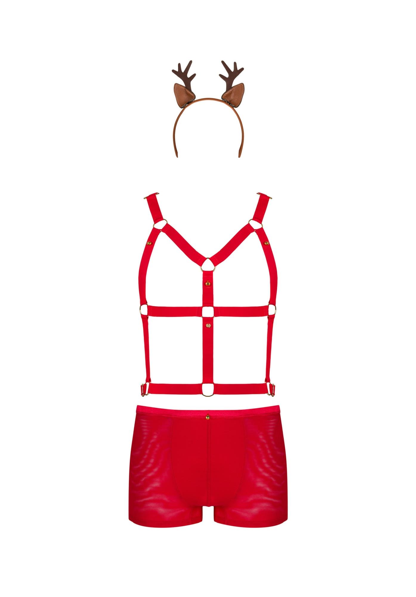 Figlarny Pan Renifer nabrał ochoty na zabawę! Pikantna, czerwona uprząż i kuszące bokserki to bardzo seksowny i zmysłowy komplet, gotowy na psoty w sypialni. Niezwykle uroczym elementem jest opaska z uszami renifera, która doskonale uzupełni całość stylizacji.
