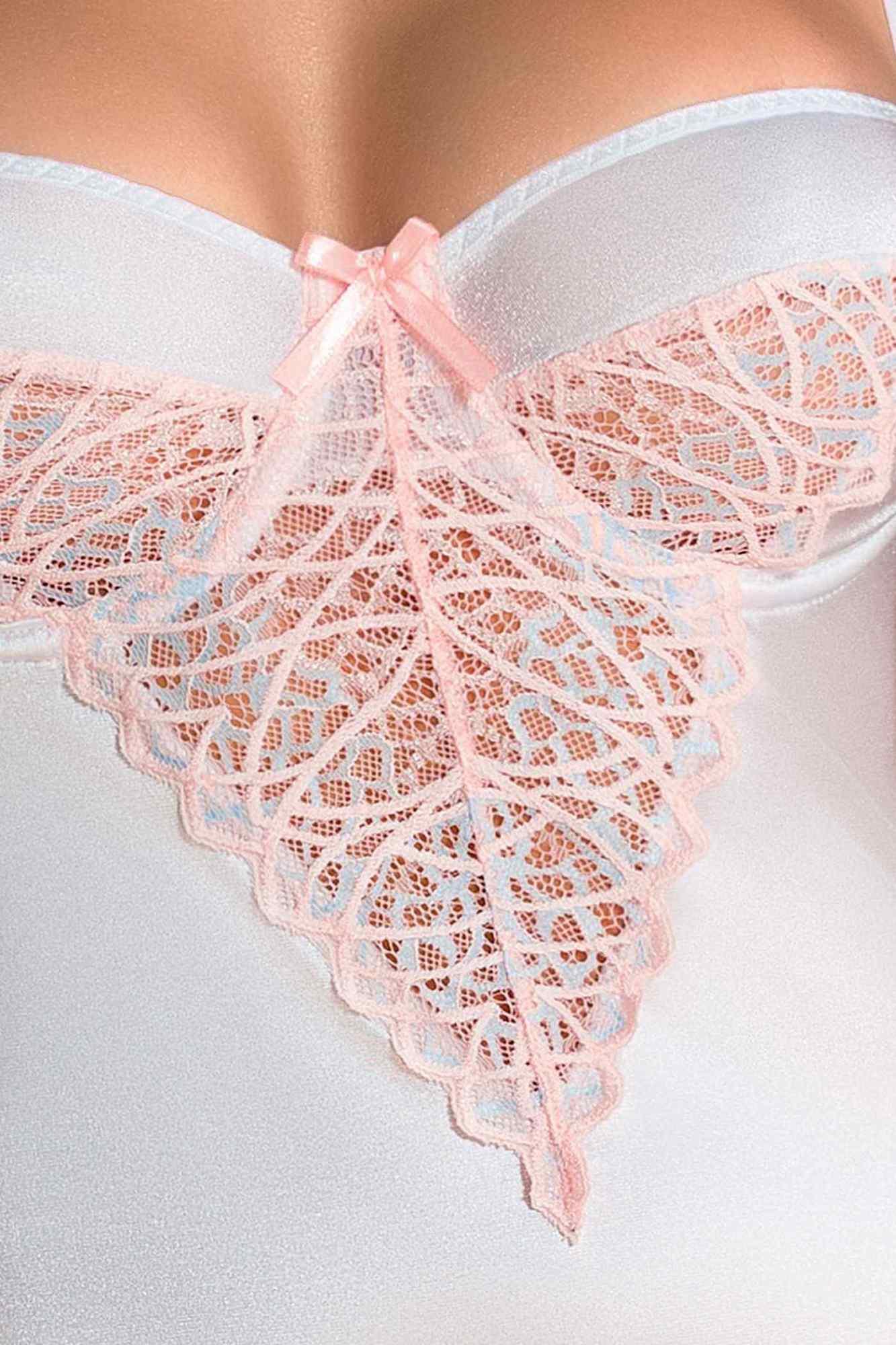 Bielizna idealna to taka, która jest jednocześnie seksowna oraz wygodna. Taka właśnie jest Nikita chemise – delikatna i nieziemsko kobieca. Biała satyna, z której wykonana jest koszula nadaje jej niezwykle subtelnego charakteru. Koszulka zapinana na wygodne haftki, posiada regulowane ramiączka, dzięki którym każda kobieta może idealnie dopasować ją do swojej figury. Zmysłowa koronka w kolorze pastelowego różu tylko utwierdza w przekonaniu o wyjątkowości i elegancji koszuli.