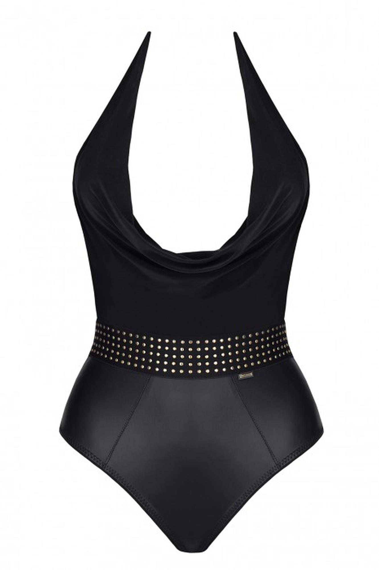 Body wykonane z czarnej, elastycznej i bardzo miłej w dotyku dzianiny oraz elastycznego, czarnego wetooka. Połączenie tych 2-u surowców ma duże znaczenie. W dolnej części lekko błyszczący wetlook pięknie podkreśla krągłości bioder i pośladków. W górnej części czarna dzianina pięknie i miękko układa się na biuście, gdzie widoczny jest efektowny, elegancki dekolt.