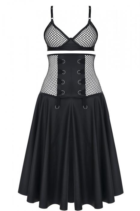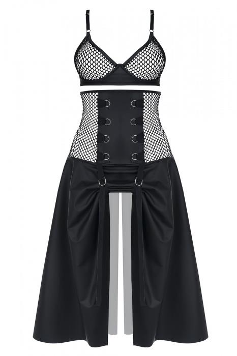 Komplet obejmujący biustonosz i spódnicę. Biustonosz posiada usztywnianą konstrukcję, dzięki czemu efektownie prezentuje widoczne pod czarną siateczką piersi. Regulowane ramiączka i 2-u stopniowe zapięcie z tyłu ułatwiają dopasowanie.