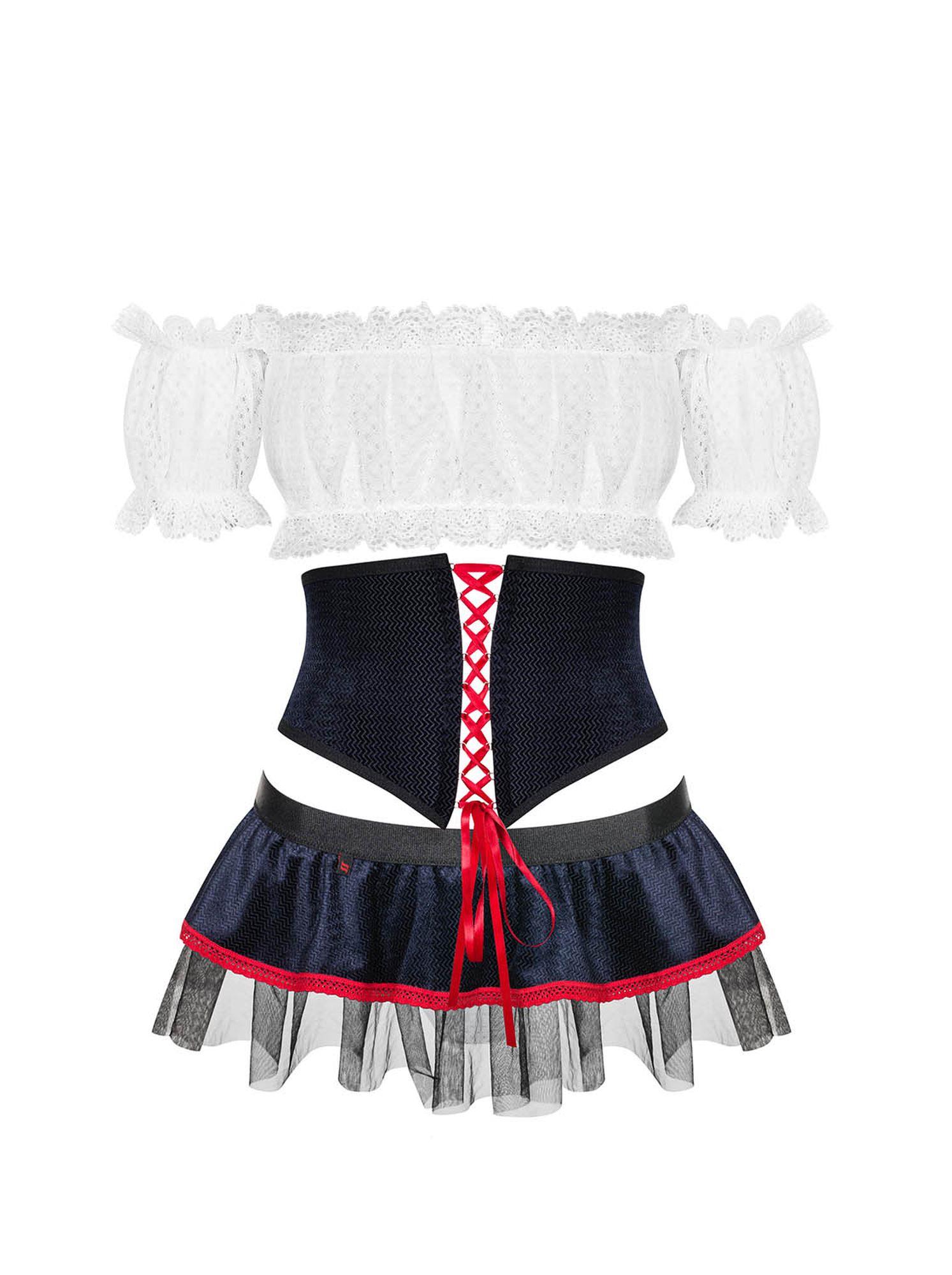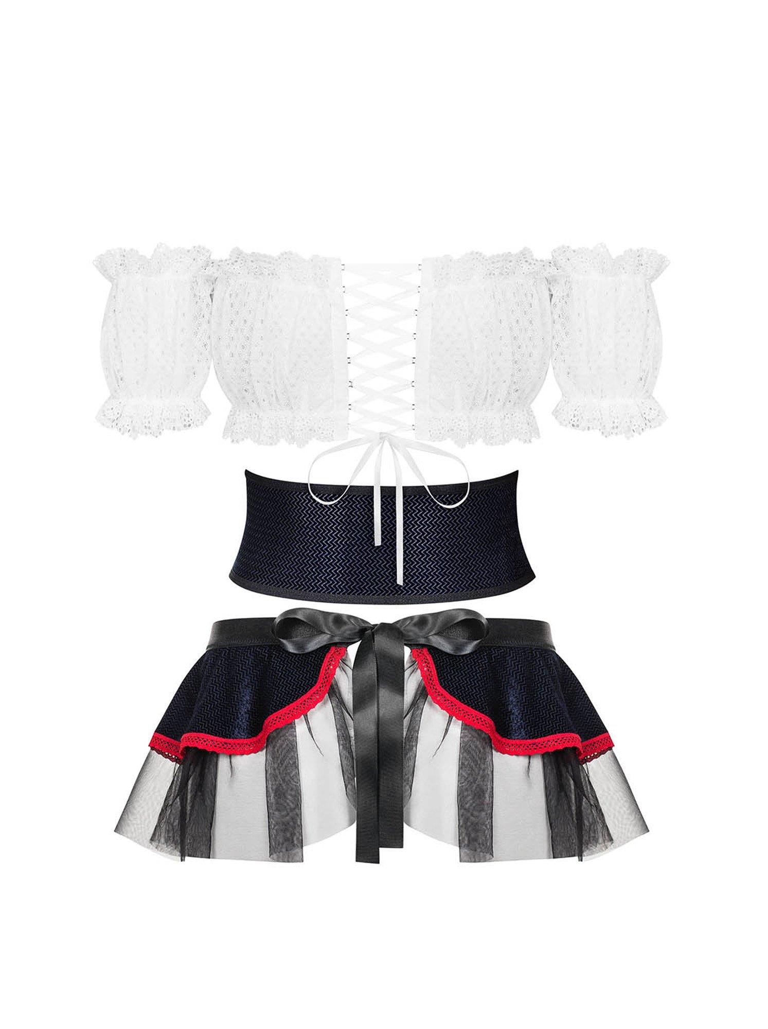 – kostium zawiera top, rękawki, pas, spódniczkę i stringi