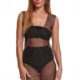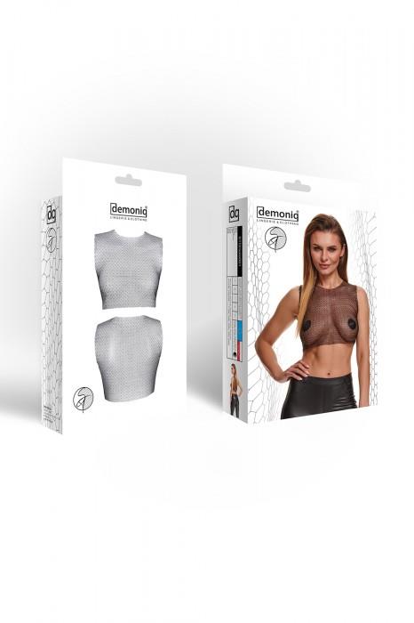 Krótki top z odkrytymi ramionami. Seksownie odkrywa dolne części ciała. W całości wykonany z czarnej, transparentnej siateczki ozdobionej splotem ze srebrnej, metalowej nitki. Doskonały z leginsami BRGiulia001 – widocznymi na zdjęciach. Kolor: czarno-srebrny. Rozmiary: S,M,L,XL,XXL. Skład surowcowy: 89% poliamid / 11% metal