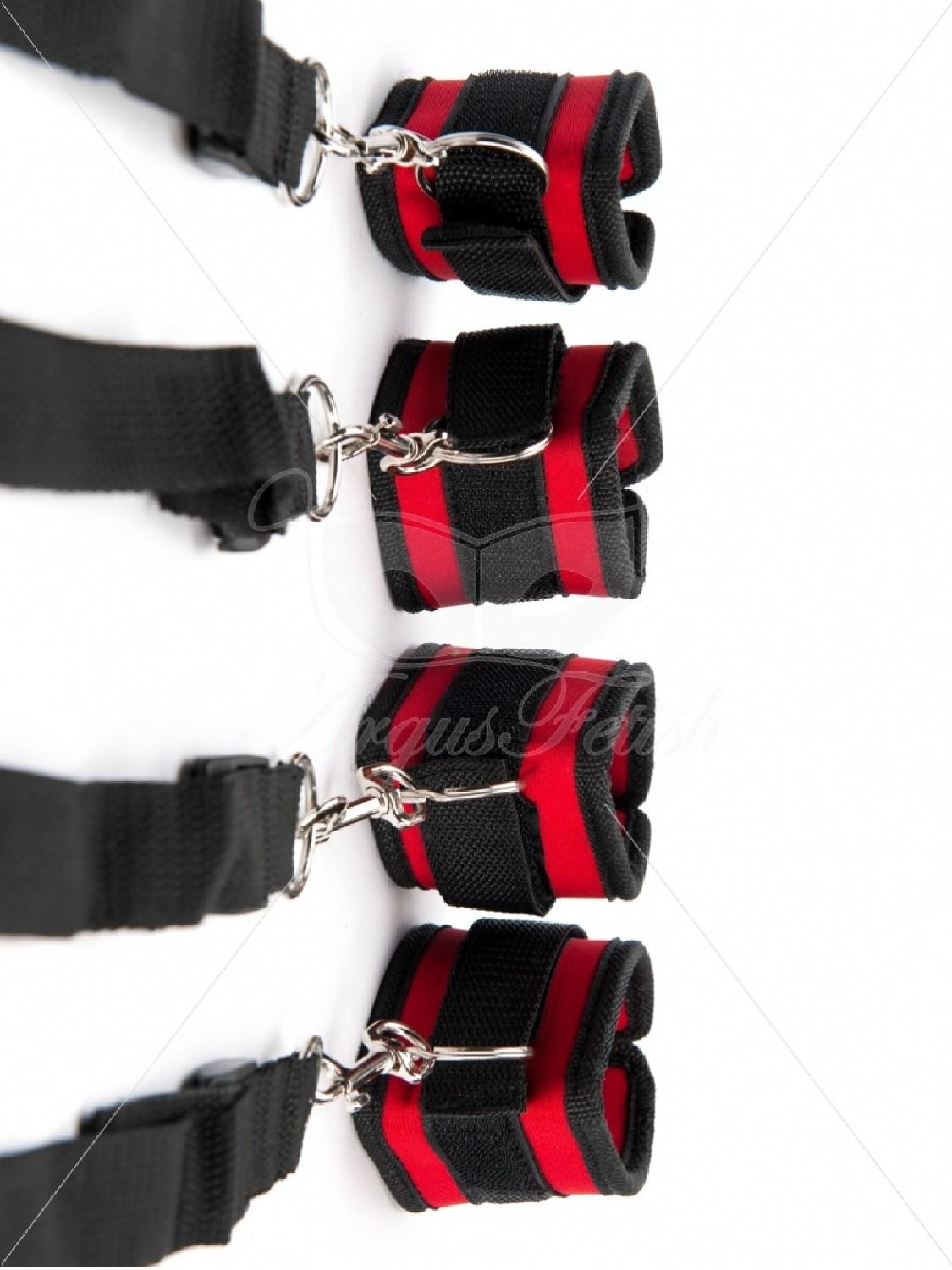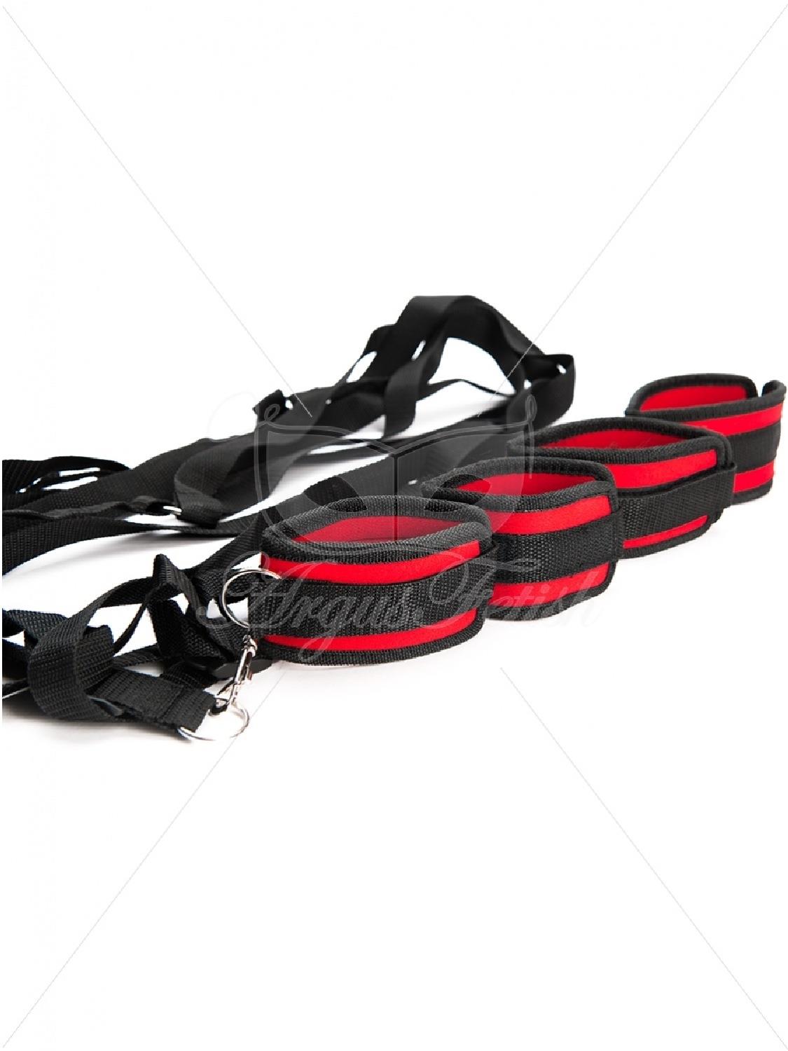Wykonany z nylonu i bezniklowego metalowego sprzętu ten system oparcia łóżka jest świetny dla każdego dzięki regulowanym czarnym i czerwonym mankietom. Wewnątrz mankietów znajduje się miękki neopren, który zapewni miły i bezpieczny chwyt w każdej chwili. Zestaw zawiera 4 sztuki mankietów, które są zabezpieczone mocnym rzepem, natomiast pasy są w pełni regulowane i posiadają karabińczyk, który można podłączyć do wszystkiego.
