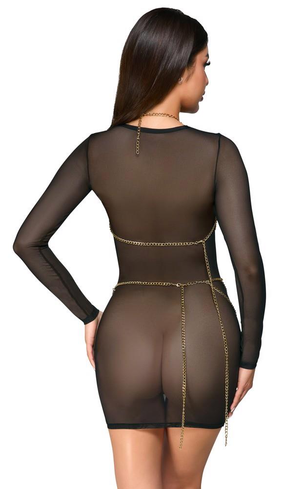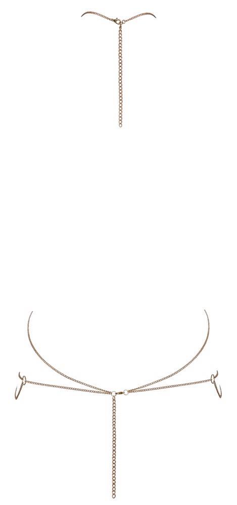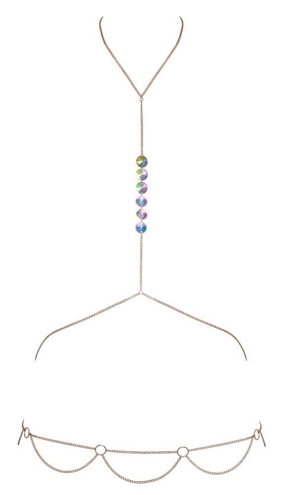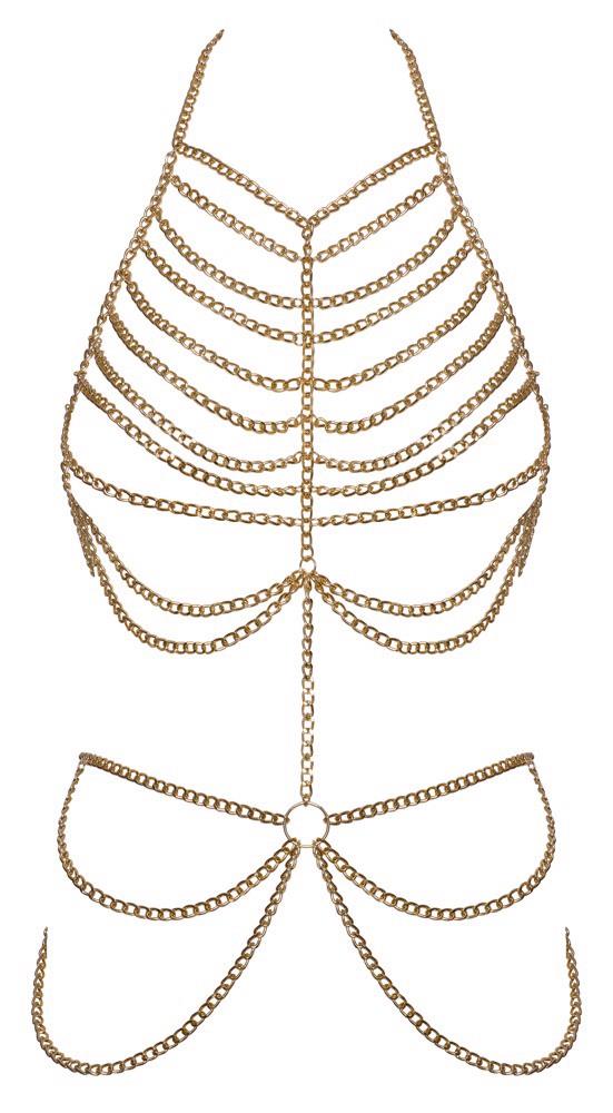 The gold-coloured body chain from Cottelli ACCESSOIRES has 6 large shimmering hologram gems between the breasts. This glamorous piece of jewellery has a neck, chest, waist and hip chain. There is with little chain decoration and rings on the hip chain. It is adjustable in various places – at the neck and over the bottom because of the snap hooks. It can be worn on its own on the naked body for a stylish and erotic look. The body chain can also be stylishly combined with swimwear or tight-fitting outfits.