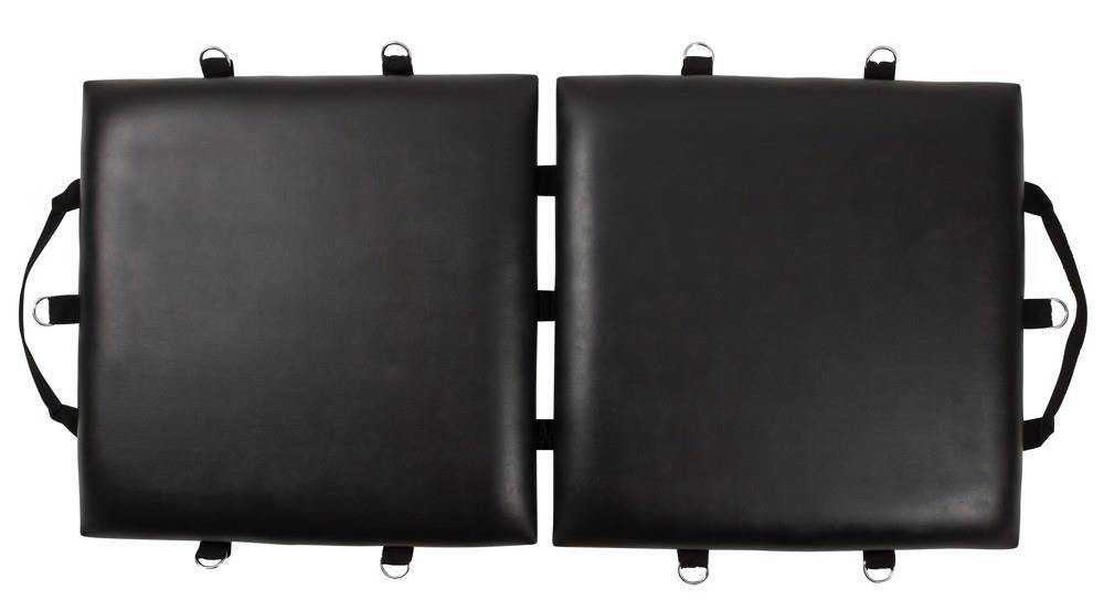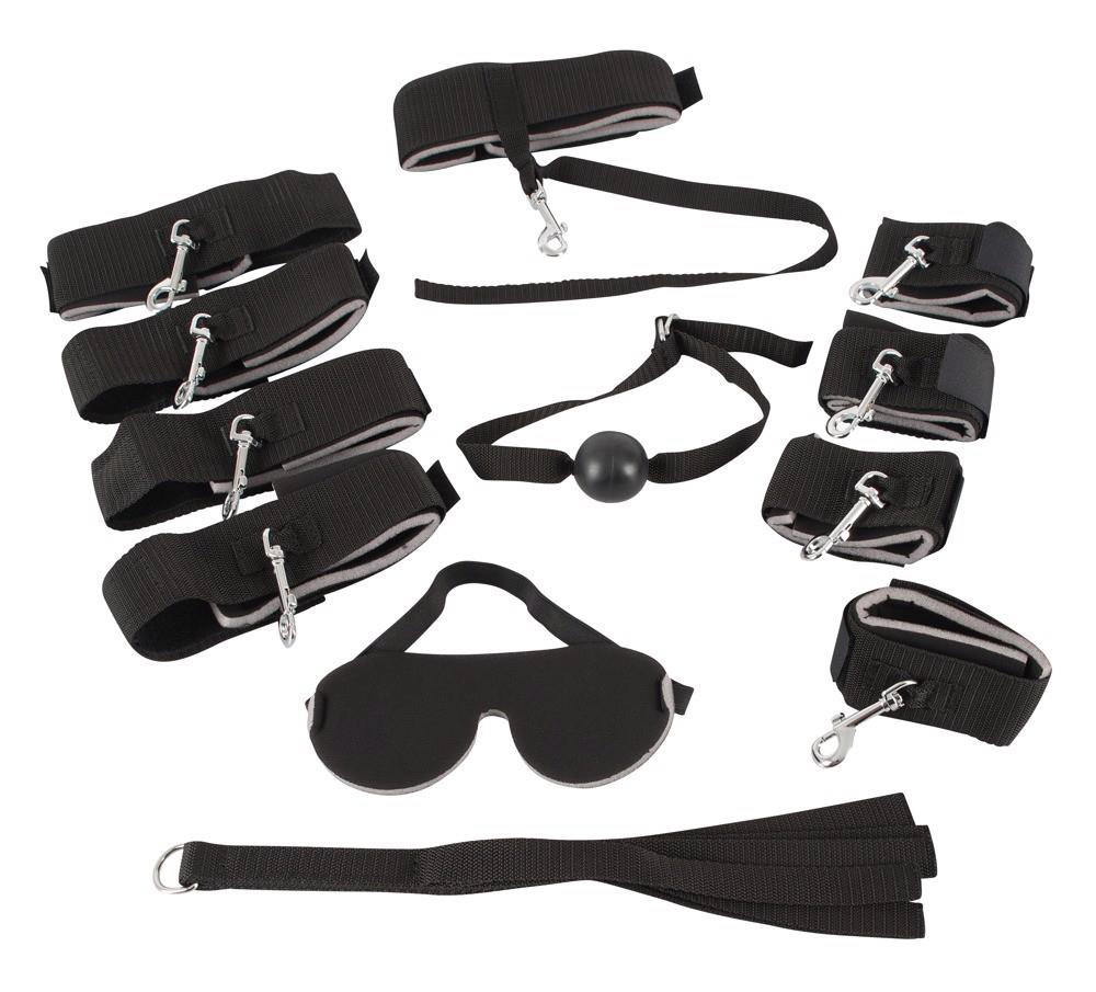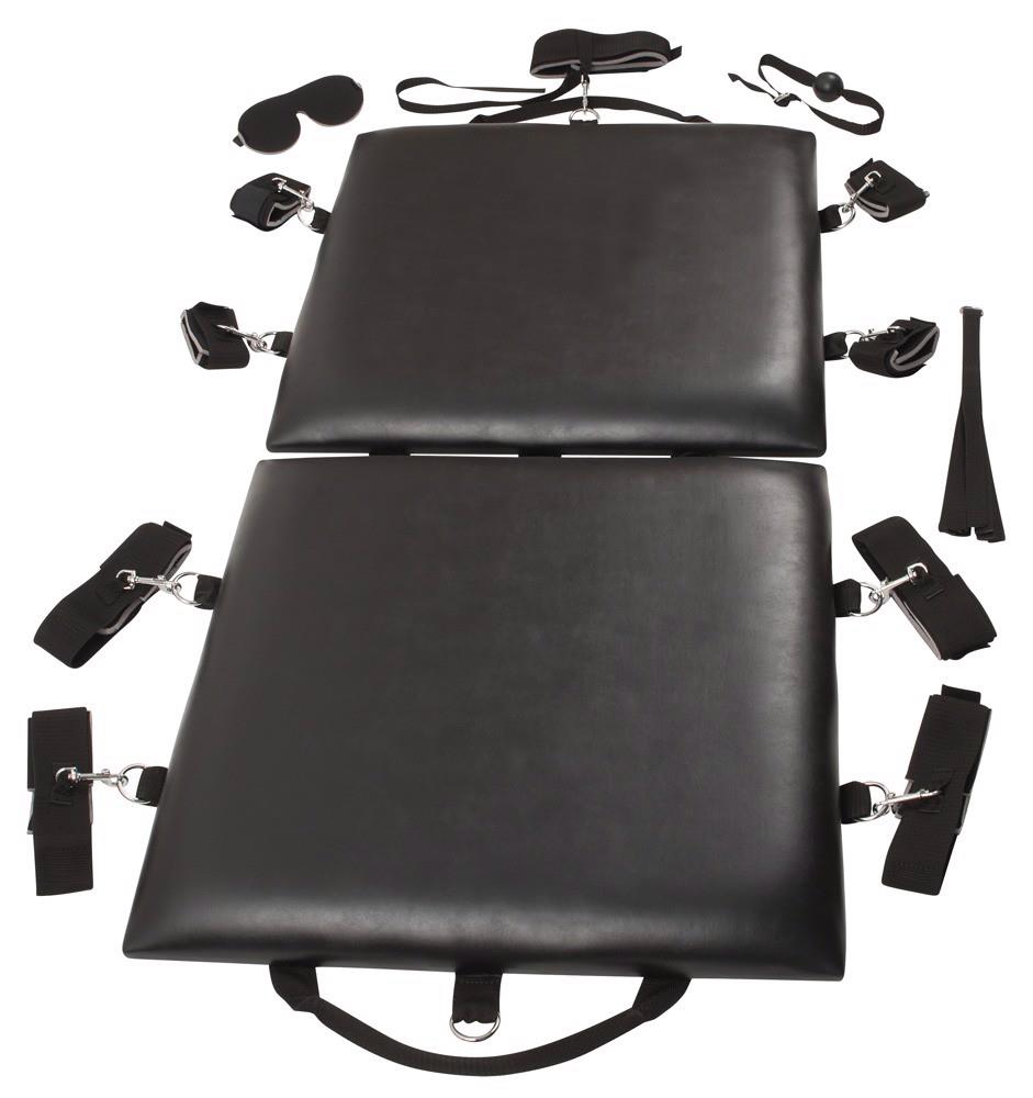 Płyta wiązania z 2 płytami 60 x 60 cm (rozłożonymi na 120 cm), w tym 4 wyściełane mankiety na ramiona (długość 39 cm, szerokość 6 cm), 4 wyściełane mankiety na nogi (długość 56 cm, szerokość 6 cm), 1 mankiet na szyję (wysokość 5,5 cm) i 1 knebel na usta (średnica 4,1 cm) z regulowanym paskiem. Bicz przekonuje długością 38 cm. Maska oczna jest wyposażona w rozciągliwy pasek.