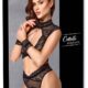 The black set from Cottelli BONDAGE contains a bra, crotchless briefs and two soft handcuffs. The set is made out of soft, stretchy delicate lace and powernet. The set also has rose gold-coloured accessories. The wireless bra has material covering the shoulders and a large cut-out at the front and back. The large stand-up collar has a restraint ring at the front and buttons at the back to fasten it. There is a hook fastener at the back as well. The waist-high briefs have a removable, stimulating chain over the crotch. The briefs also have a ring at the back and at either side. These rings are for attaching the stretchy lace restraints. The lace restraints have chains with snap hooks.