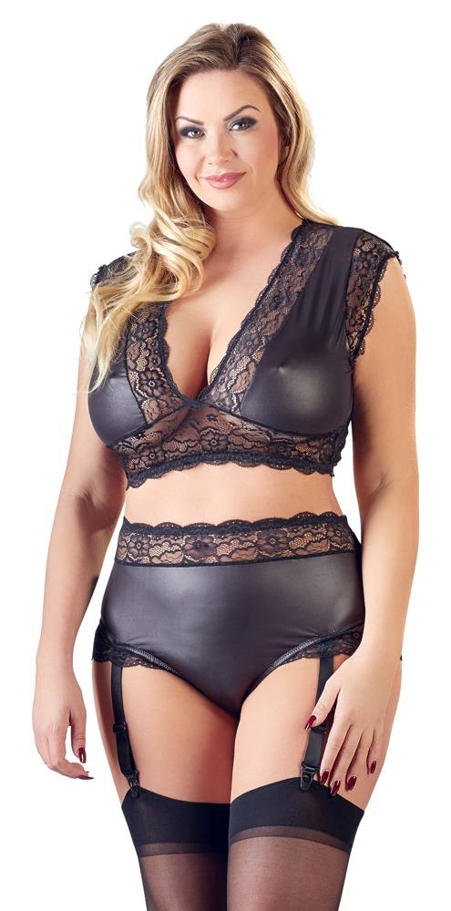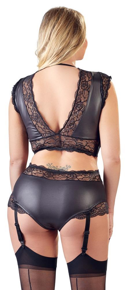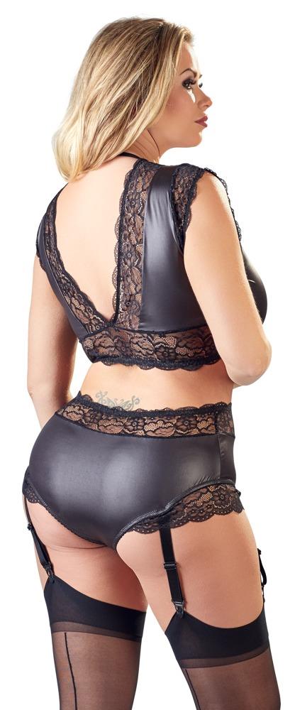 Top and suspender briefs made out of trendy matte look material with exciting lace inserts that let the skin shimmer through in a sexy way. The top is low-cut at the front and the back. A small stretchy strap around the back of the neck helps the top fit perfectly and it stops it from slipping too. The adjustable suspender straps can be removed from the briefs.