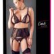 The wireless bra, suspender belt & string in a set from kissable is made entirely out of delicate black powernet with elaborate floral embroidery in pink and purple. It is soft and stretchy which means that it is very comfortable to wear. There is a playful satin bow at the front of the wireless bra and at each side of the string. The bra has a clip fastener at the back and the straps are adjustable. The suspender belt has a hook fastener at the back and adjustable suspender straps. The small string is extremely seductive because of its two narrow stretchy straps that meet in the crotch area.