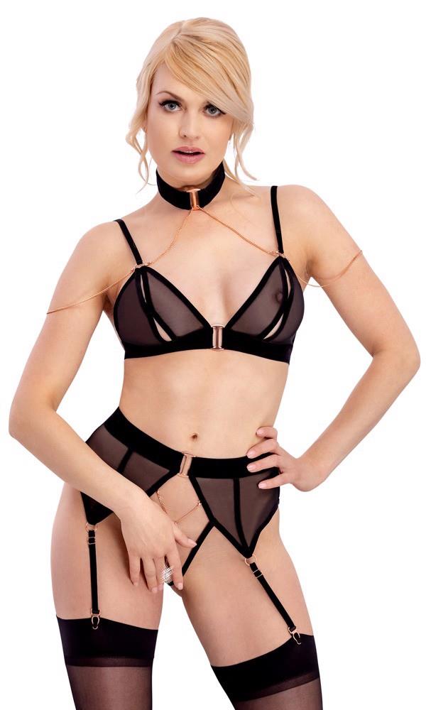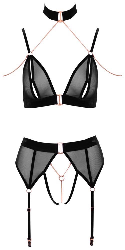Miękki biustonosz i majtki typu ouvert w komplecie marki Abierta Fina. Oba elementy wykonane z czarnej elastycznej przezroczystości z wyrafinowanymi detalami z aksamitu i metalowymi elementami w kolorze różowego złota. Ekscytujący biustonosz fascynuje opalizującymi łańcuchami, które prowadzą do aksamitnego naszyjnika i przez ramię – a miseczki z rozcięciem są czystą pokusą. Majtki na szelkach prowokują swoim całkowicie otwartym kroczem, przez które prowadzi stymulujący łańcuszek. Mons veneris jest dodatkowo ozdobiony pierścieniem z dżetów. Paski do pończoch i ramiączka biustonosza są regulowane dla optymalnego dopasowania. Wszystkie łańcuchy są zdejmowalne.