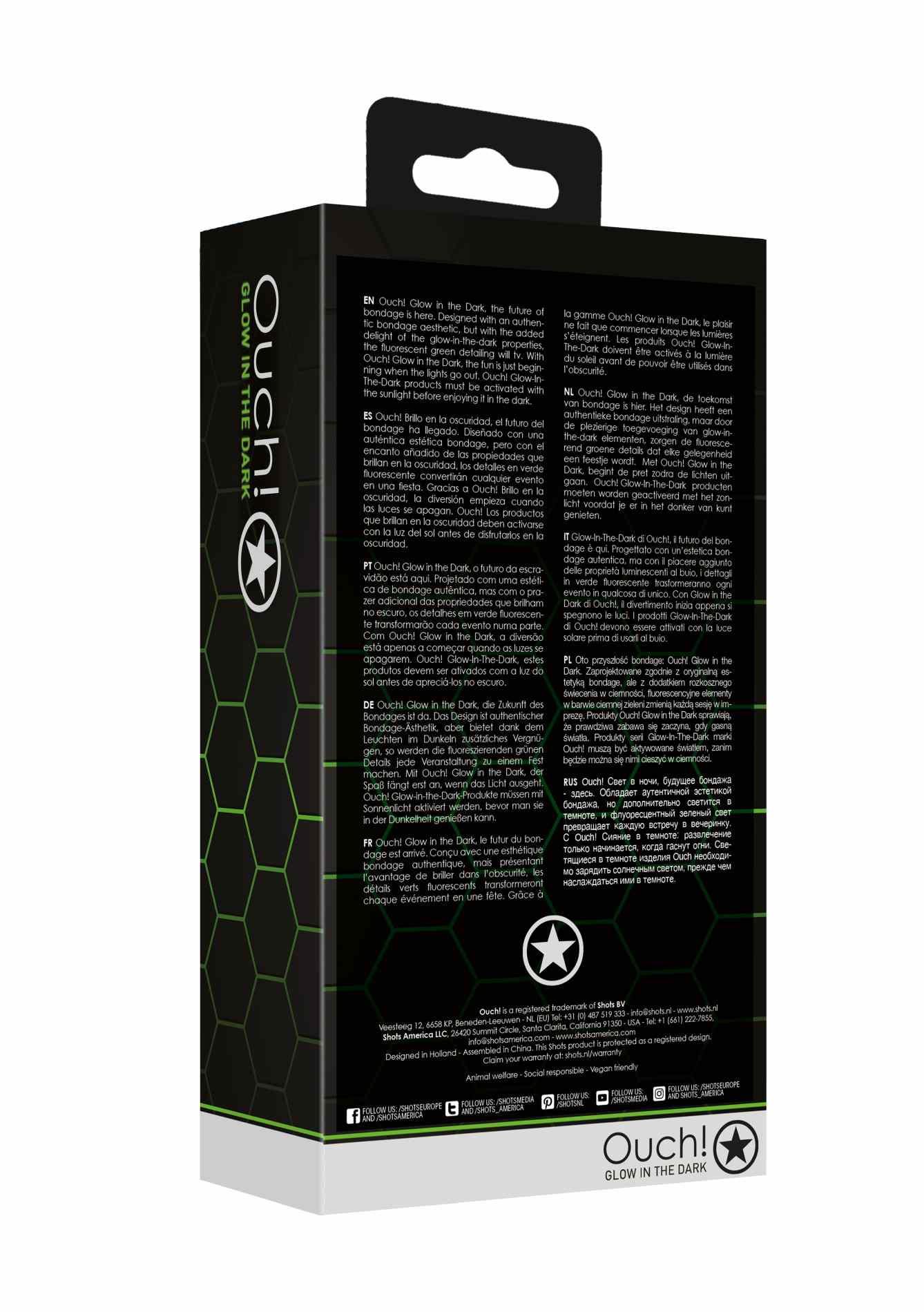 Ouch! Glow in the Dark. Zaprojektowane zgodnie z oryginalną estetyką bondage, ale z dodatkiem rozkosznego świecenia w ciemności, fluorescencyjne elementy w barwie ciemnej zieleni zmienią każdą sesję w imprezę.