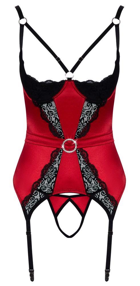 Demi cup cami suspenders and a crotchless thong from Cottelli LINGERIE in a set. Made of stretchy red satin and adorned with delicate lace and contrasting elements in black. Super soft and stretchy for high comfort. The incorporated balcony bra is padded and puts the breasts in the limelight and is perfectly framed and supported by the cup’s straps and underwire. Shimmering rhinestone rings between the cups and at the front of the waistband complete the package. The straps and suspenders are very elastic and can be adjusted to fit. The back of the cami suspenders features a row of hook fasteners and the matching thong is invitingly open in the crotch.