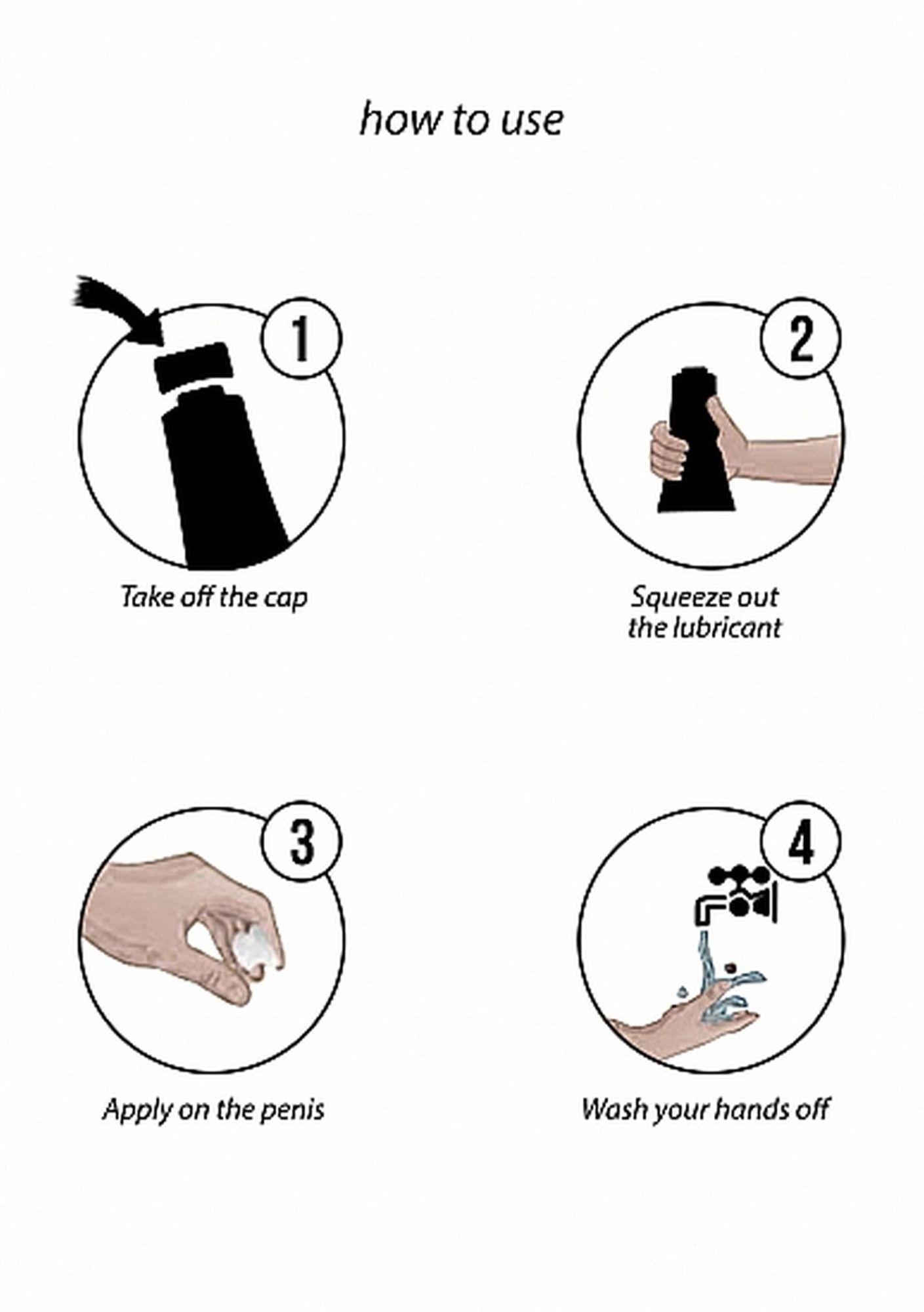 Nałóż produkt na penisa i wmasuj. Przed regularnym stosowaniem należy posmarować wewnętrzną stronę przedramienia, aby sprawdzić, czy występują reakcje alergiczne. W przypadku wystąpienia podrażnienia natychmiast przerwać stosowanie. Wyłącznie do użytku zewnętrznego. Należy przechowywać poza zasięgiem dzieci. Przechowywać w chłodnym, zacienionym miejscu.