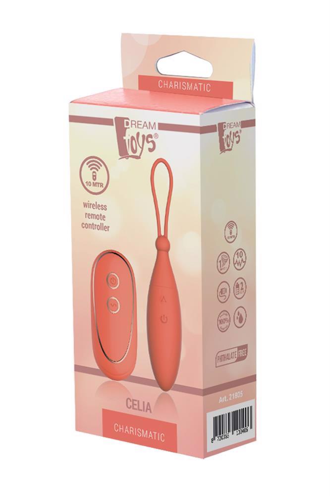 Ta zabawka jest wykonana z silikonu Ultra Premium i ma gładki owalny kształt. Celia ma stylowy i świeży wygląd oraz wyraźny koralowo-różowy kolor, który łączy się z akcentami w kolorze różowego złota na pilocie. Wibracje można łatwo regulować podczas użytkowania za pomocą bezprzewodowego pilota o zasięgu 10 metrów. Zarówno jajko, jak i pilot można ładować za pomocą dołączonego kabla USB. Dolną nasadkę jajka można zdjąć w celu naładowania.
