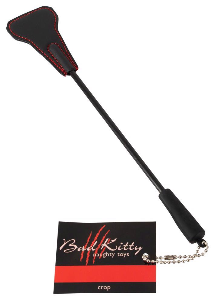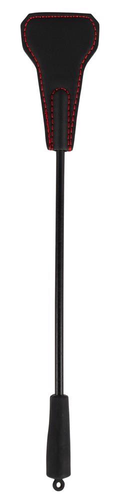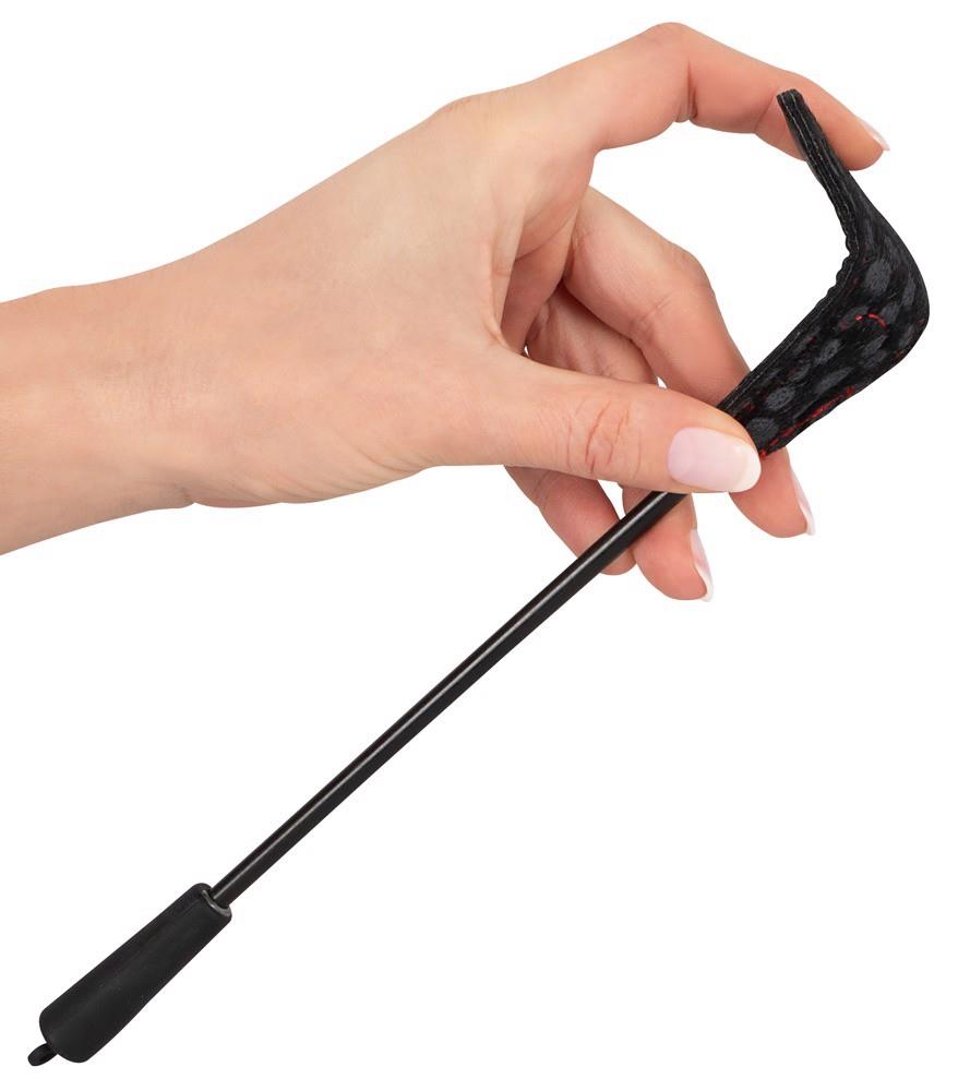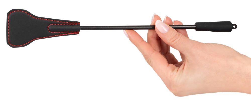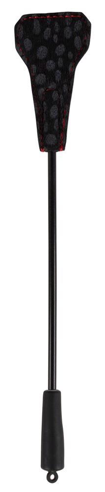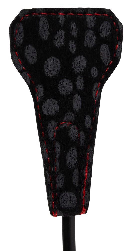 Mały czarny bicz z łopatką (optyka może się różnić). Jedna strona w wyglądzie skóry, druga ze sztucznym futrem. Czerwone przeszycia.