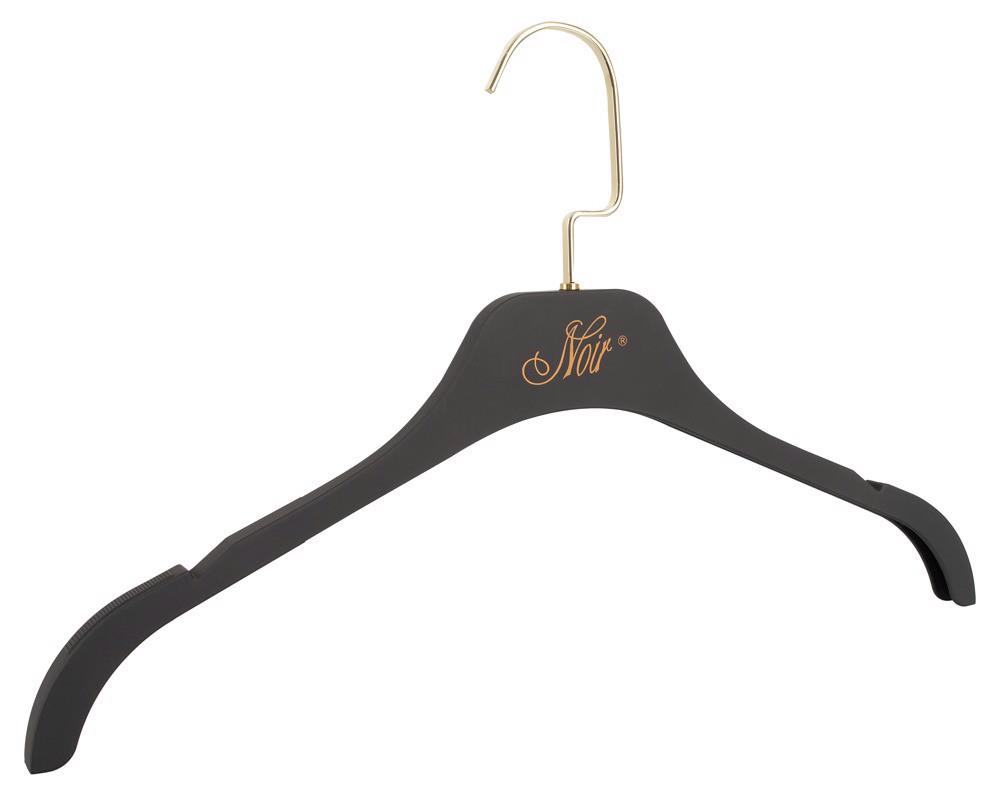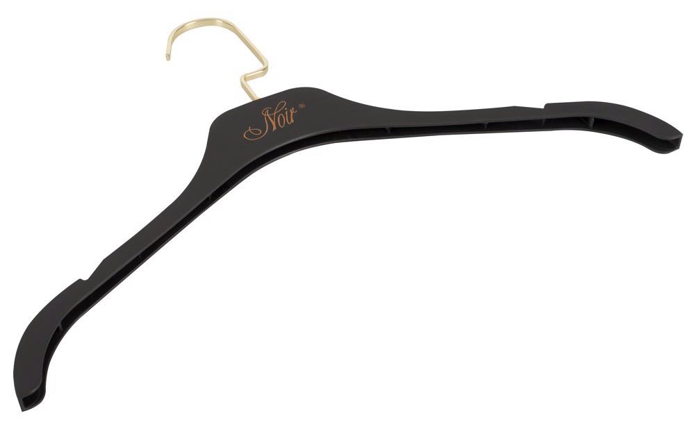 Czarny matowy wieszak z nadrukiem NOIR w kolorze złotym i złotym haczykiem o długości 10 cm.