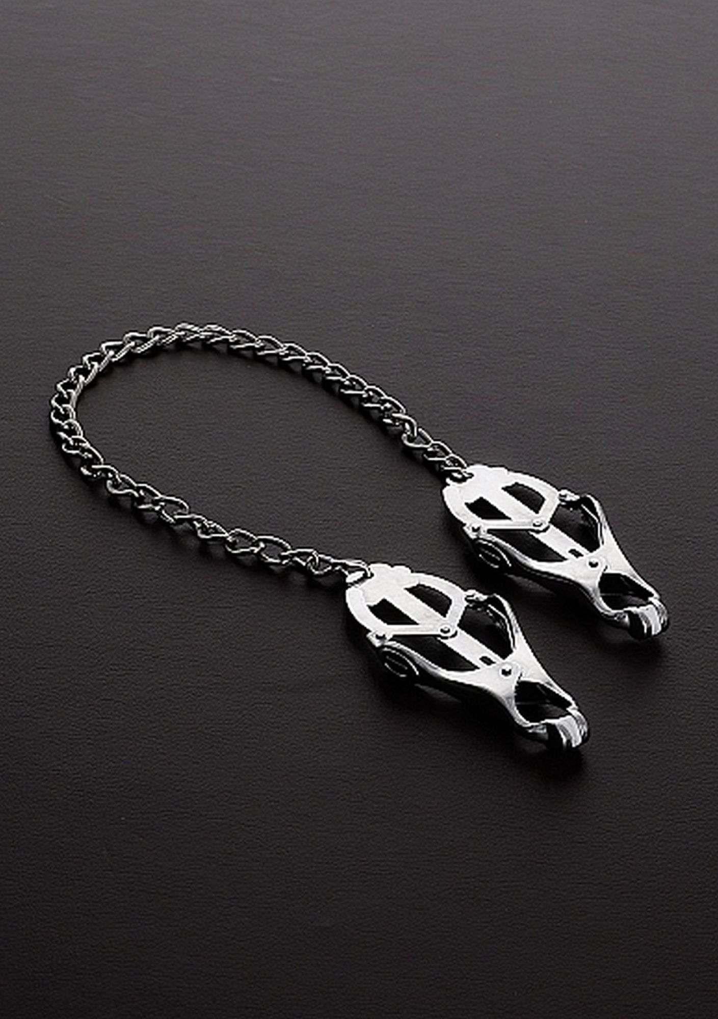 Są to klasyczne zaciski smoczkowe koniczyny z długim łańcuchem łączącym oba zaciski ze sobą. Te zaciski na sutki koniczyny działają najlepiej, gdy są przymocowane do obu sutków, a łańcuch wywiera niewielki nacisk.