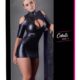 Ta czarna sukienka mini ze stójką i krótkimi rękawami zachwyca odkrytymi ramionami i wyrafinowanym dekoltem. Matowy, błyszczący materiał typu wet look ściśle przylega do ciała i w zgrabny i uwodzicielski sposób eksponuje kobiece krągłości.