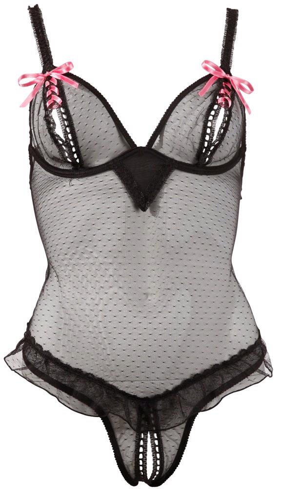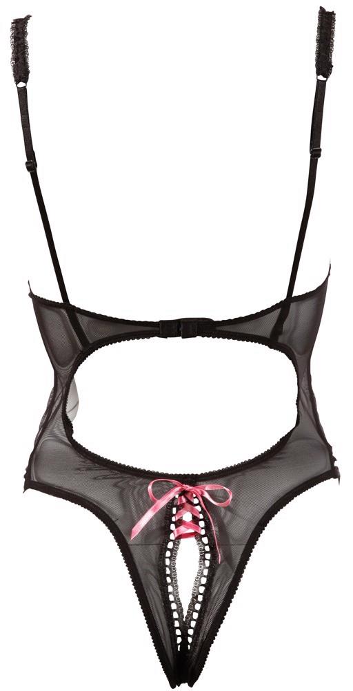 Ciało to urzeka otwartymi fiszbinowymi miseczkami, które sznurowane są małą, satynową kokardką oraz otwartym kroczem, również sznurowanym małymi, satynowymi kokardkami. Zachwycająca i seksowna w wyglądzie lat 50-tych jest mała falbanka, która zdobi talię. Paski regulowane. Zamknięcie na hak z tyłu. Kolor: Czarny/Różowy.